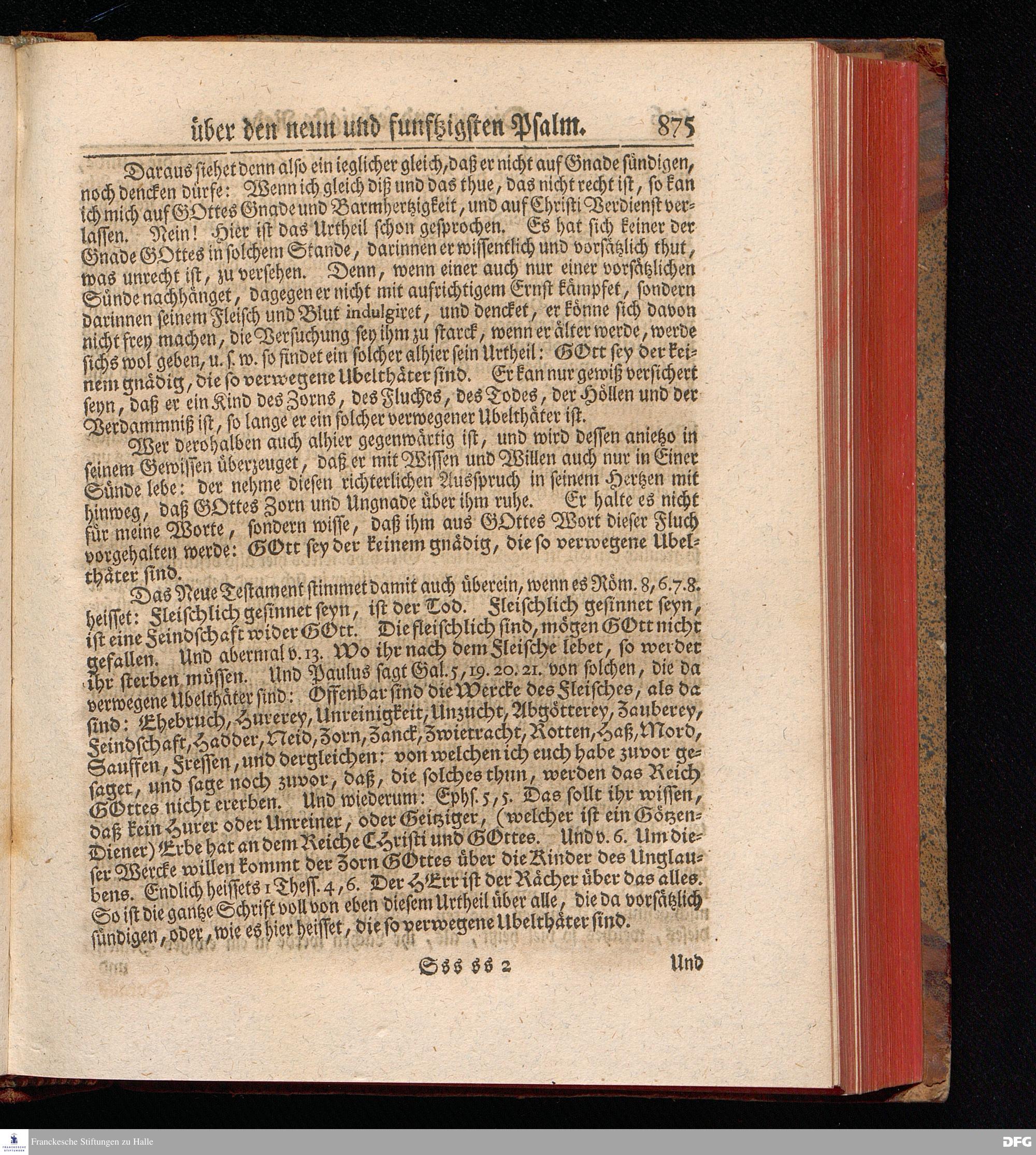 August Hermann Franckens, Weyl.Prof.Theol.Past.Ulr.und Schol. Erklärung Der Psalmen Davids; Erster [und] Anderer Theil, Mit einer Vorrede herausgegeben Von Gotthilf August Francken, S.S.Theol.Doct.und Prof.Publ.Ord.der ersten Dioeces des Saal-Creyses Inspectore und Pred.zur L.Fr. Andere Auflage. HALLE, in Verlegung des Wäysen=Hauses MDCCXLIII--MDCCXLV.