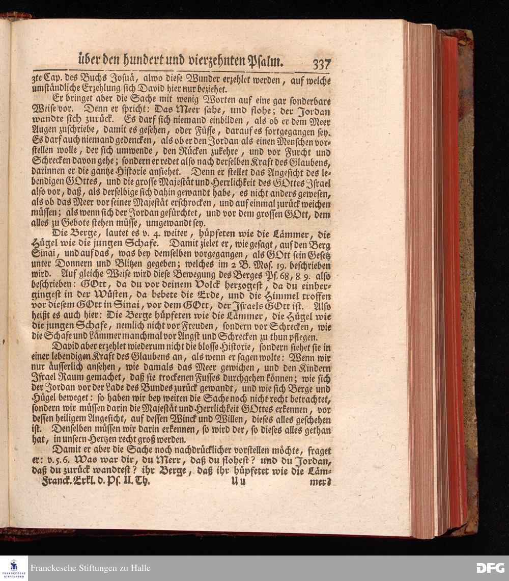 August Hermann Franckens, Weyl.Prof.Theol.Past.Ulr.und Schol. Erklärung Der Psalmen Davids; Erster [und] Anderer Theil, Mit einer Vorrede herausgegeben Von Gotthilf August Francken, S.S.Theol.Doct.und Prof.Publ.Ord.der ersten Dioeces des Saal-Creyses Inspectore und Pred.zur L.Fr. Andere Auflage. HALLE, in Verlegung des Wäysen=Hauses MDCCXLIII--MDCCXLV.