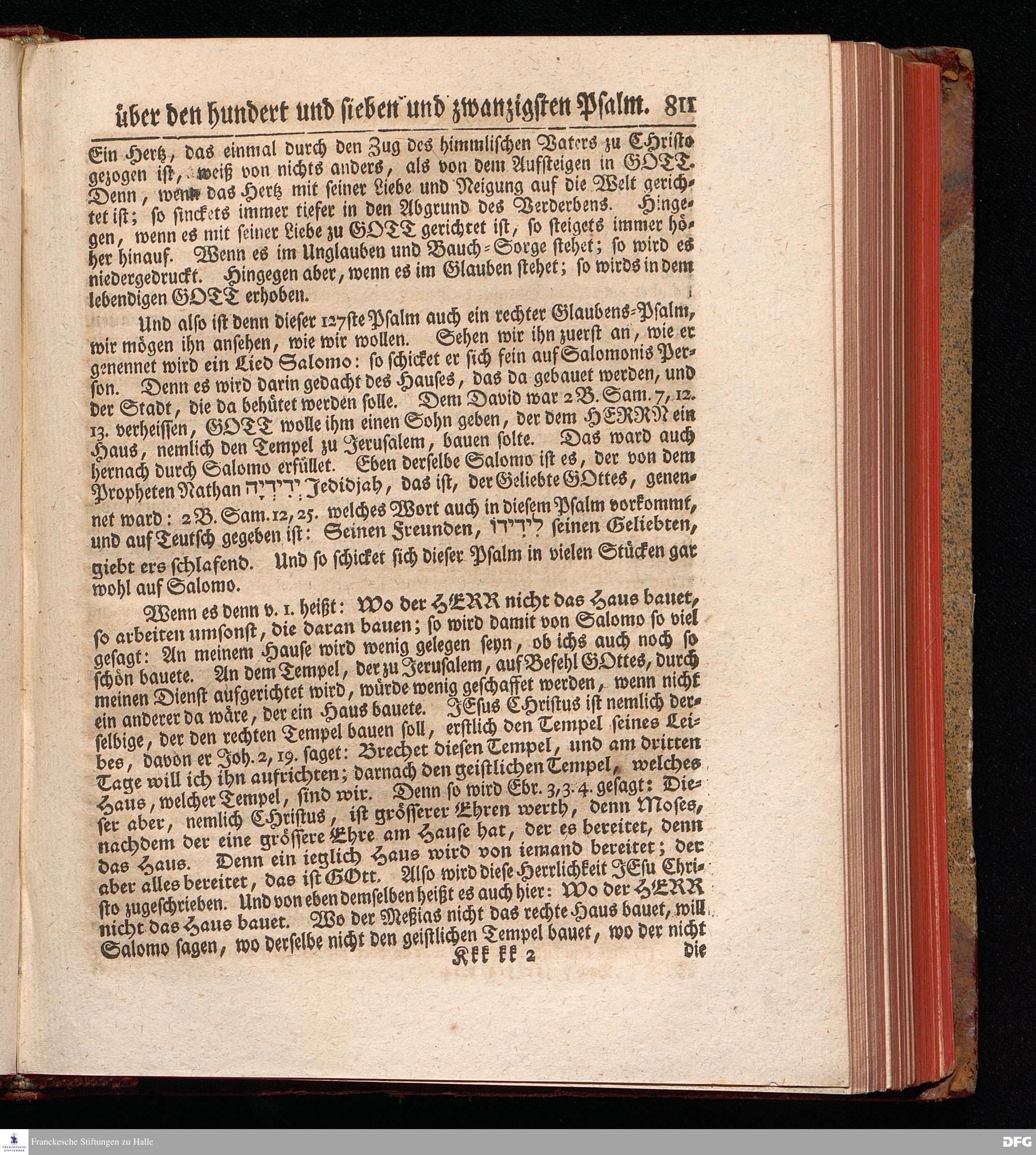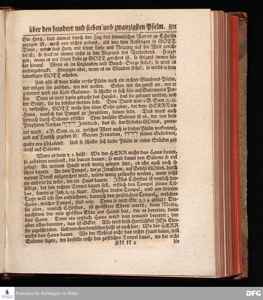 August Hermann Franckens, Weyl.Prof.Theol.Past.Ulr.und Schol. Erklärung Der Psalmen Davids; Erster [und] Anderer Theil, Mit einer Vorrede herausgegeben Von Gotthilf August Francken, S.S.Theol.Doct.und Prof.Publ.Ord.der ersten Dioeces des Saal-Creyses Inspectore und Pred.zur L.Fr. Andere Auflage. HALLE, in Verlegung des Wäysen=Hauses MDCCXLIII--MDCCXLV.