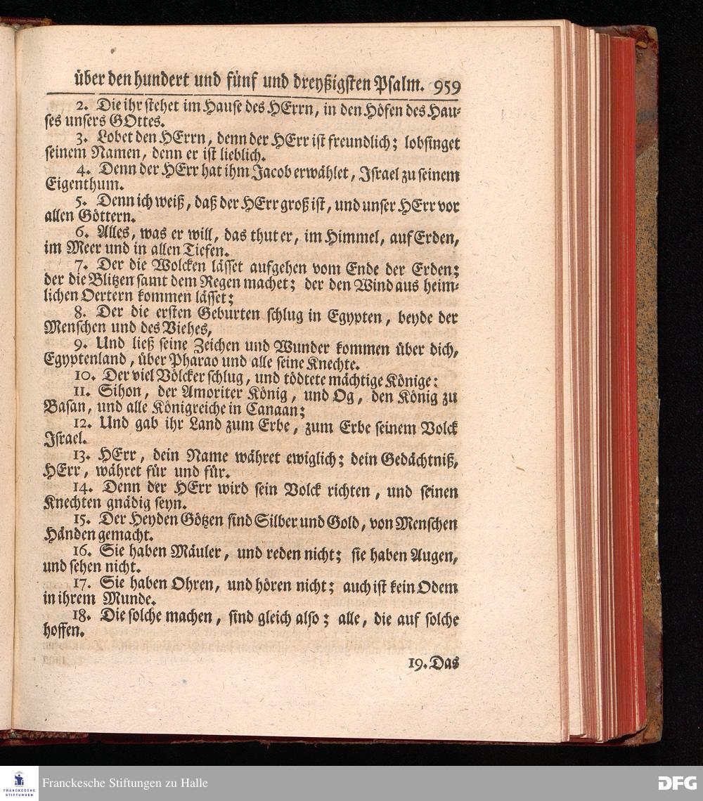 August Hermann Franckens, Weyl.Prof.Theol.Past.Ulr.und Schol. Erklärung Der Psalmen Davids; Erster [und] Anderer Theil, Mit einer Vorrede herausgegeben Von Gotthilf August Francken, S.S.Theol.Doct.und Prof.Publ.Ord.der ersten Dioeces des Saal-Creyses Inspectore und Pred.zur L.Fr. Andere Auflage. HALLE, in Verlegung des Wäysen=Hauses MDCCXLIII--MDCCXLV.
