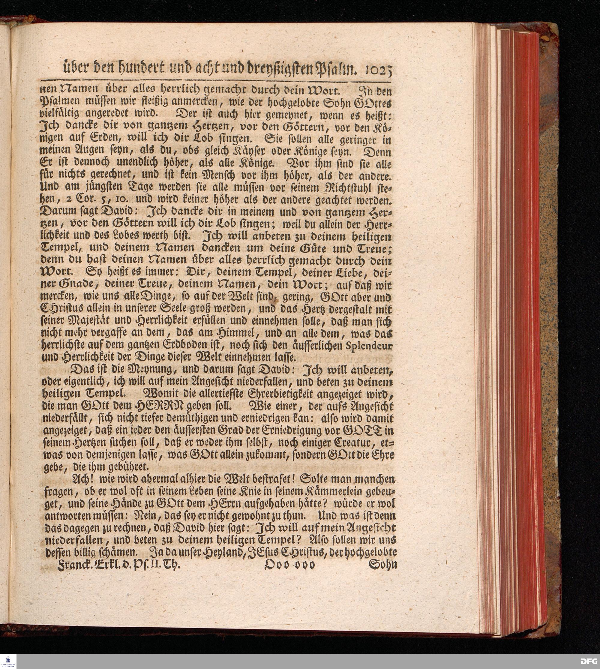 August Hermann Franckens, Weyl.Prof.Theol.Past.Ulr.und Schol. Erklärung Der Psalmen Davids; Erster [und] Anderer Theil, Mit einer Vorrede herausgegeben Von Gotthilf August Francken, S.S.Theol.Doct.und Prof.Publ.Ord.der ersten Dioeces des Saal-Creyses Inspectore und Pred.zur L.Fr. Andere Auflage. HALLE, in Verlegung des Wäysen=Hauses MDCCXLIII--MDCCXLV.
