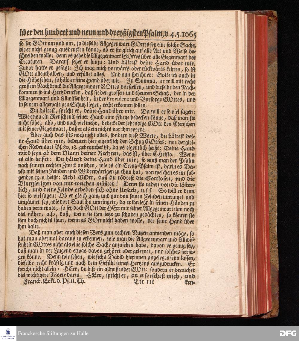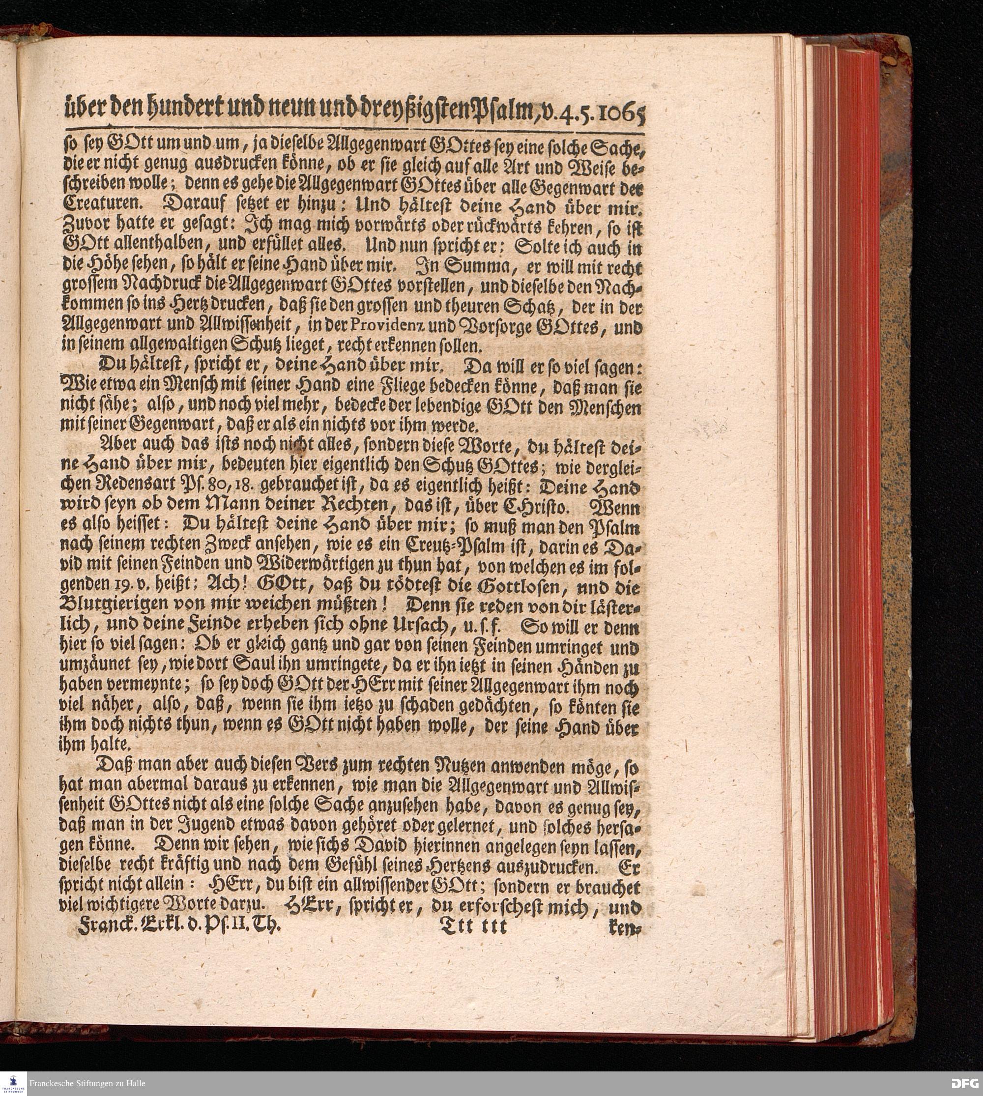 August Hermann Franckens, Weyl.Prof.Theol.Past.Ulr.und Schol. Erklärung Der Psalmen Davids; Erster [und] Anderer Theil, Mit einer Vorrede herausgegeben Von Gotthilf August Francken, S.S.Theol.Doct.und Prof.Publ.Ord.der ersten Dioeces des Saal-Creyses Inspectore und Pred.zur L.Fr. Andere Auflage. HALLE, in Verlegung des Wäysen=Hauses MDCCXLIII--MDCCXLV.