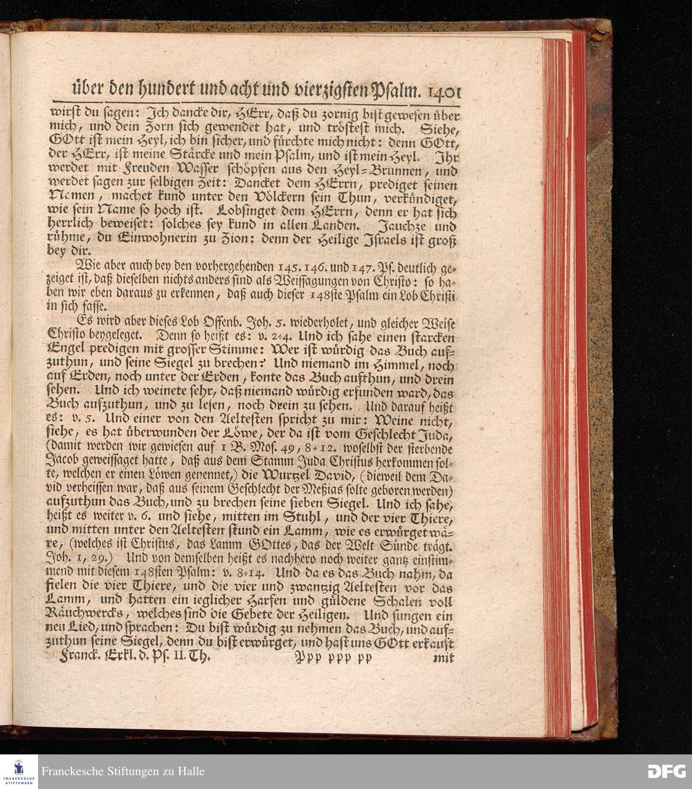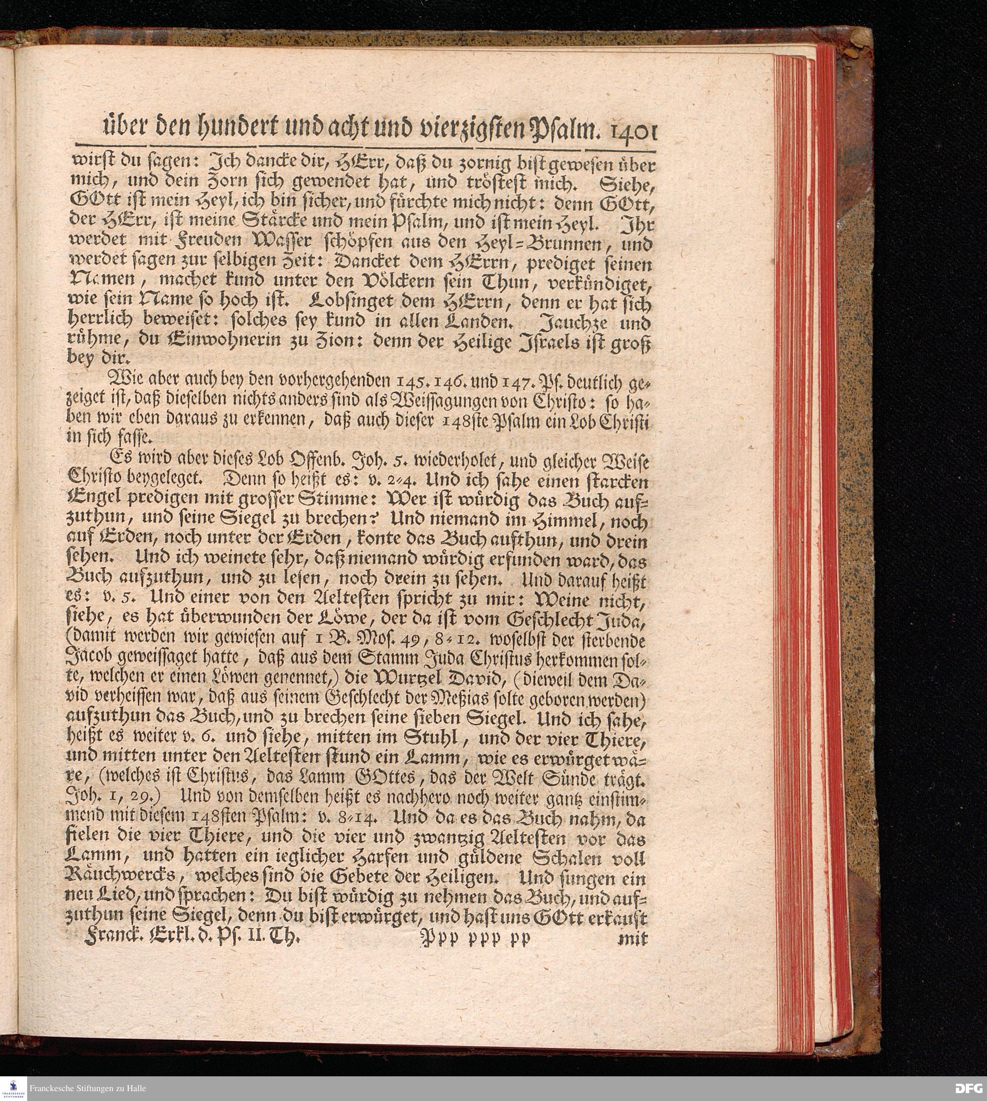 August Hermann Franckens, Weyl.Prof.Theol.Past.Ulr.und Schol. Erklärung Der Psalmen Davids; Erster [und] Anderer Theil, Mit einer Vorrede herausgegeben Von Gotthilf August Francken, S.S.Theol.Doct.und Prof.Publ.Ord.der ersten Dioeces des Saal-Creyses Inspectore und Pred.zur L.Fr. Andere Auflage. HALLE, in Verlegung des Wäysen=Hauses MDCCXLIII--MDCCXLV.