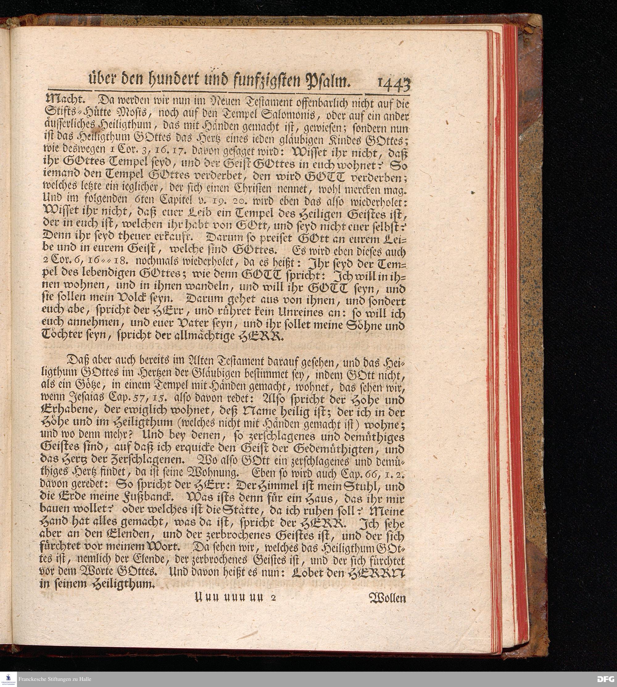 August Hermann Franckens, Weyl.Prof.Theol.Past.Ulr.und Schol. Erklärung Der Psalmen Davids; Erster [und] Anderer Theil, Mit einer Vorrede herausgegeben Von Gotthilf August Francken, S.S.Theol.Doct.und Prof.Publ.Ord.der ersten Dioeces des Saal-Creyses Inspectore und Pred.zur L.Fr. Andere Auflage. HALLE, in Verlegung des Wäysen=Hauses MDCCXLIII--MDCCXLV.