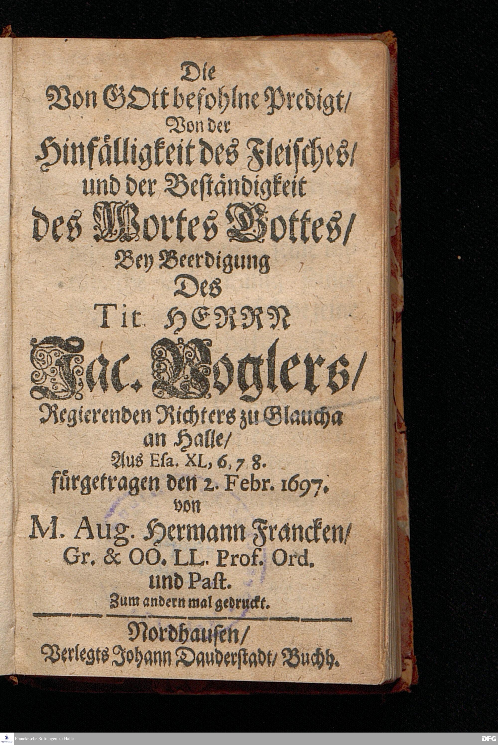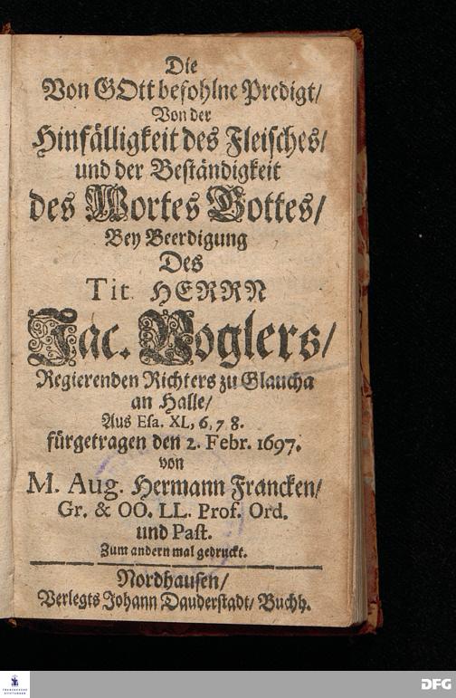 Die Von GOtt befohlne Predigt / Von der Hinfälligkeit des Fleisches / und der Beständigkeit des Wortes Gottes / Bey Beerdigung Des Tit.HERRN Jac.Voglers / Regierenden Richters zu Glaucha an Halle / Aus Esa. XL,6.7.8. fürgetragen den 2.Febr. 1697. von M.Aug.Hermann Francken / Gr.& OO.LL.Prof.Ord. und Past. Zum andern mal gedruckt. Nordhausen / Verlegts Johann Dauderstadt / Buchh.
