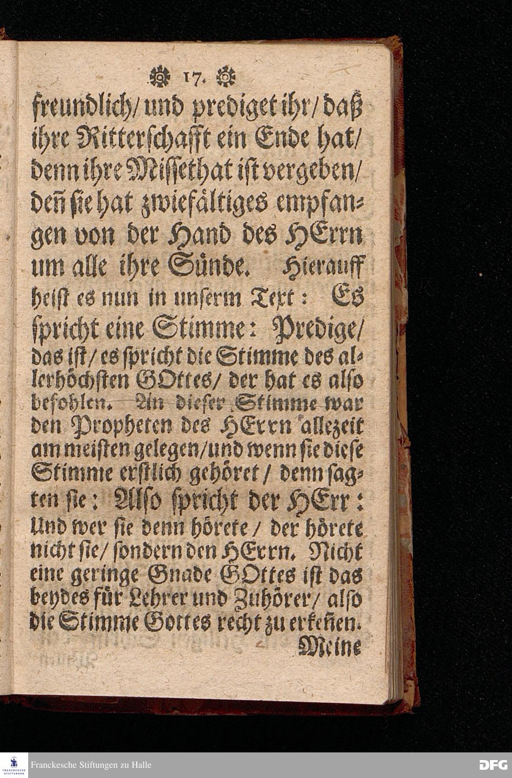 Die Von GOtt befohlne Predigt / Von der Hinfälligkeit des Fleisches / und der Beständigkeit des Wortes Gottes / Bey Beerdigung Des Tit.HERRN Jac.Voglers / Regierenden Richters zu Glaucha an Halle / Aus Esa. XL,6.7.8. fürgetragen den 2.Febr. 1697. von M.Aug.Hermann Francken / Gr.& OO.LL.Prof.Ord. und Past. Zum andern mal gedruckt. Nordhausen / Verlegts Johann Dauderstadt / Buchh.