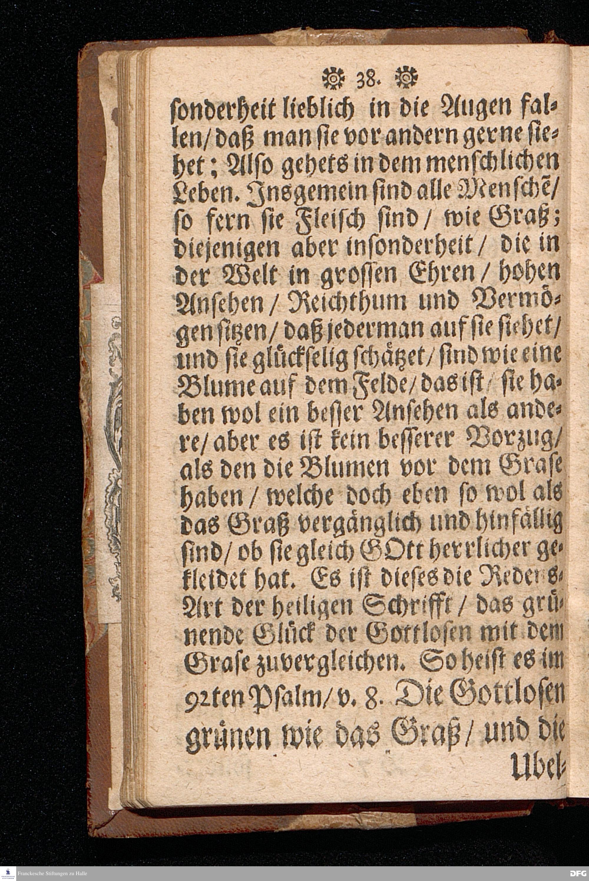Die Von GOtt befohlne Predigt / Von der Hinfälligkeit des Fleisches / und der Beständigkeit des Wortes Gottes / Bey Beerdigung Des Tit.HERRN Jac.Voglers / Regierenden Richters zu Glaucha an Halle / Aus Esa. XL,6.7.8. fürgetragen den 2.Febr. 1697. von M.Aug.Hermann Francken / Gr.& OO.LL.Prof.Ord. und Past. Zum andern mal gedruckt. Nordhausen / Verlegts Johann Dauderstadt / Buchh.