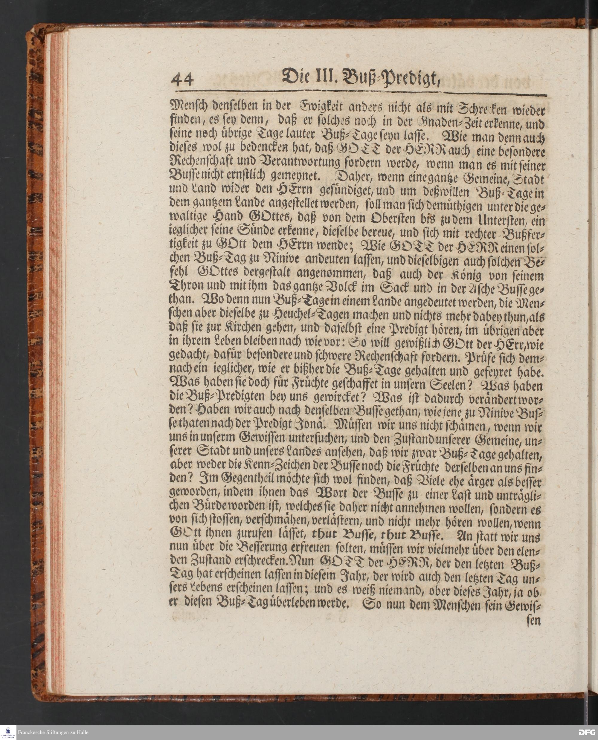 August Hermann Franckens SS.Theol.Prof.Ord.& Past.Vlriciani, Buß=Predigten, Darinnen aus verschiedenen Texten Heil. Schrift deutlich gezeiget wird, Wie nicht nur Unbekehrte zur wahren Busse gelangen, sondern auch die, so bekehret sind, in täglicher Busse und Gottseligkeit leben und wandeln sollen. Erster und Anderer Theil. Fünfte Auflage. Mit Königl. Preuß. und Churfl. Brandenb. Privilegio. HALLE, in Verlegung des Waysenhauses, MDCCXLV.