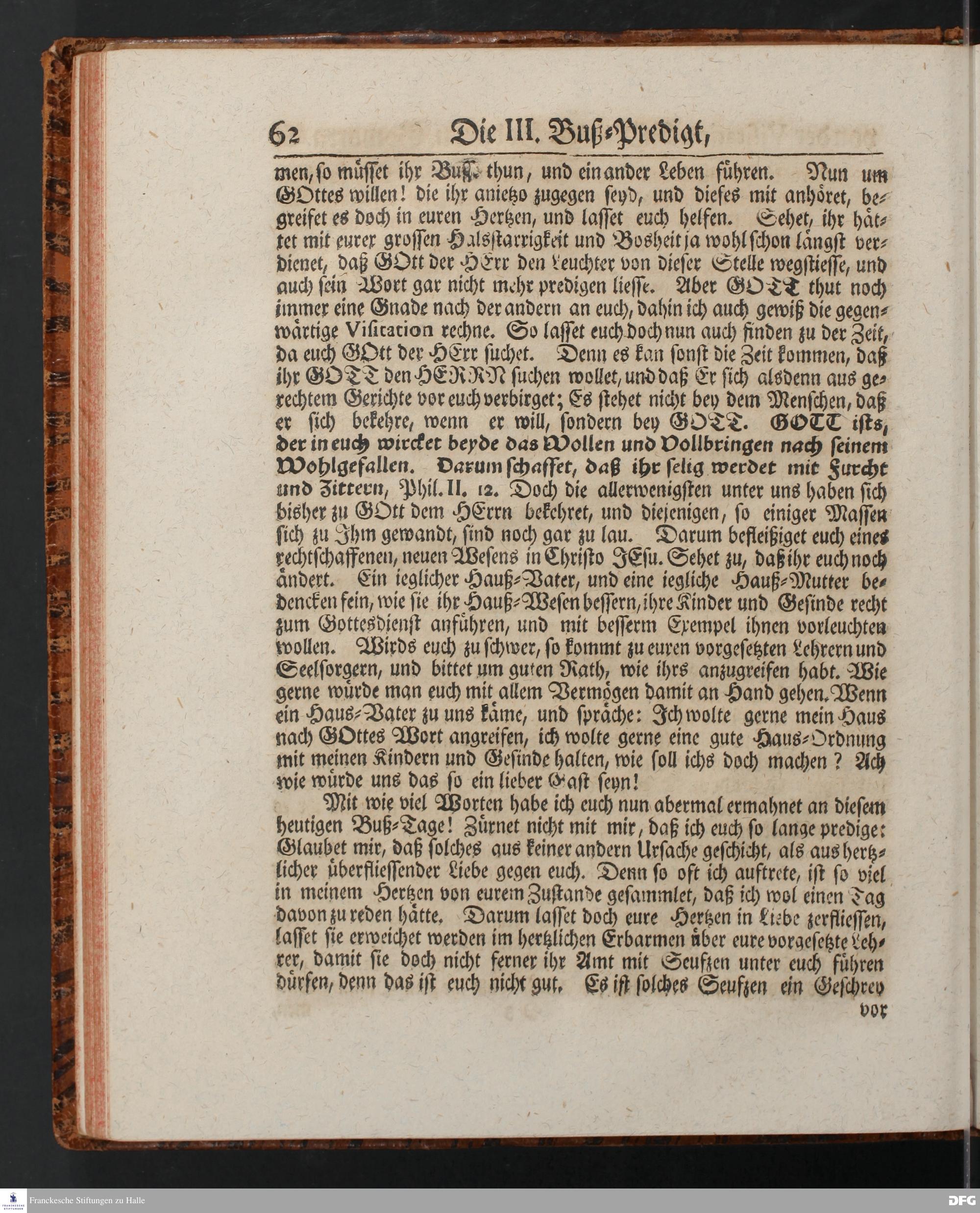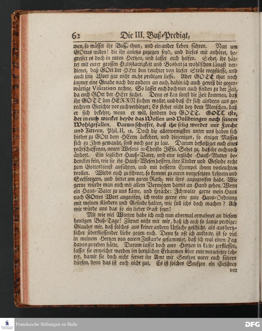 August Hermann Franckens SS.Theol.Prof.Ord.& Past.Vlriciani, Buß=Predigten, Darinnen aus verschiedenen Texten Heil. Schrift deutlich gezeiget wird, Wie nicht nur Unbekehrte zur wahren Busse gelangen, sondern auch die, so bekehret sind, in täglicher Busse und Gottseligkeit leben und wandeln sollen. Erster und Anderer Theil. Fünfte Auflage. Mit Königl. Preuß. und Churfl. Brandenb. Privilegio. HALLE, in Verlegung des Waysenhauses, MDCCXLV.