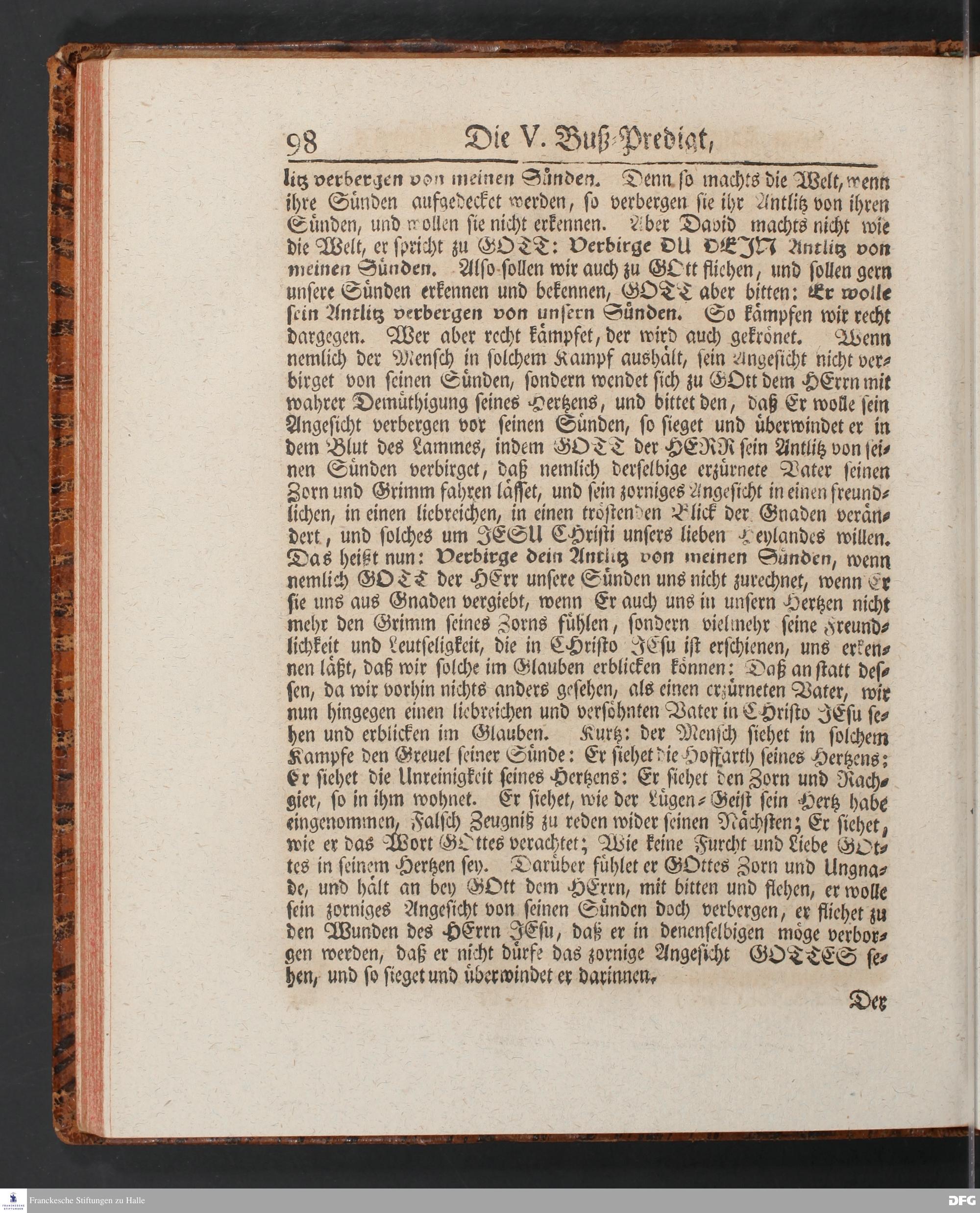 August Hermann Franckens SS.Theol.Prof.Ord.& Past.Vlriciani, Buß=Predigten, Darinnen aus verschiedenen Texten Heil. Schrift deutlich gezeiget wird, Wie nicht nur Unbekehrte zur wahren Busse gelangen, sondern auch die, so bekehret sind, in täglicher Busse und Gottseligkeit leben und wandeln sollen. Erster und Anderer Theil. Fünfte Auflage. Mit Königl. Preuß. und Churfl. Brandenb. Privilegio. HALLE, in Verlegung des Waysenhauses, MDCCXLV.