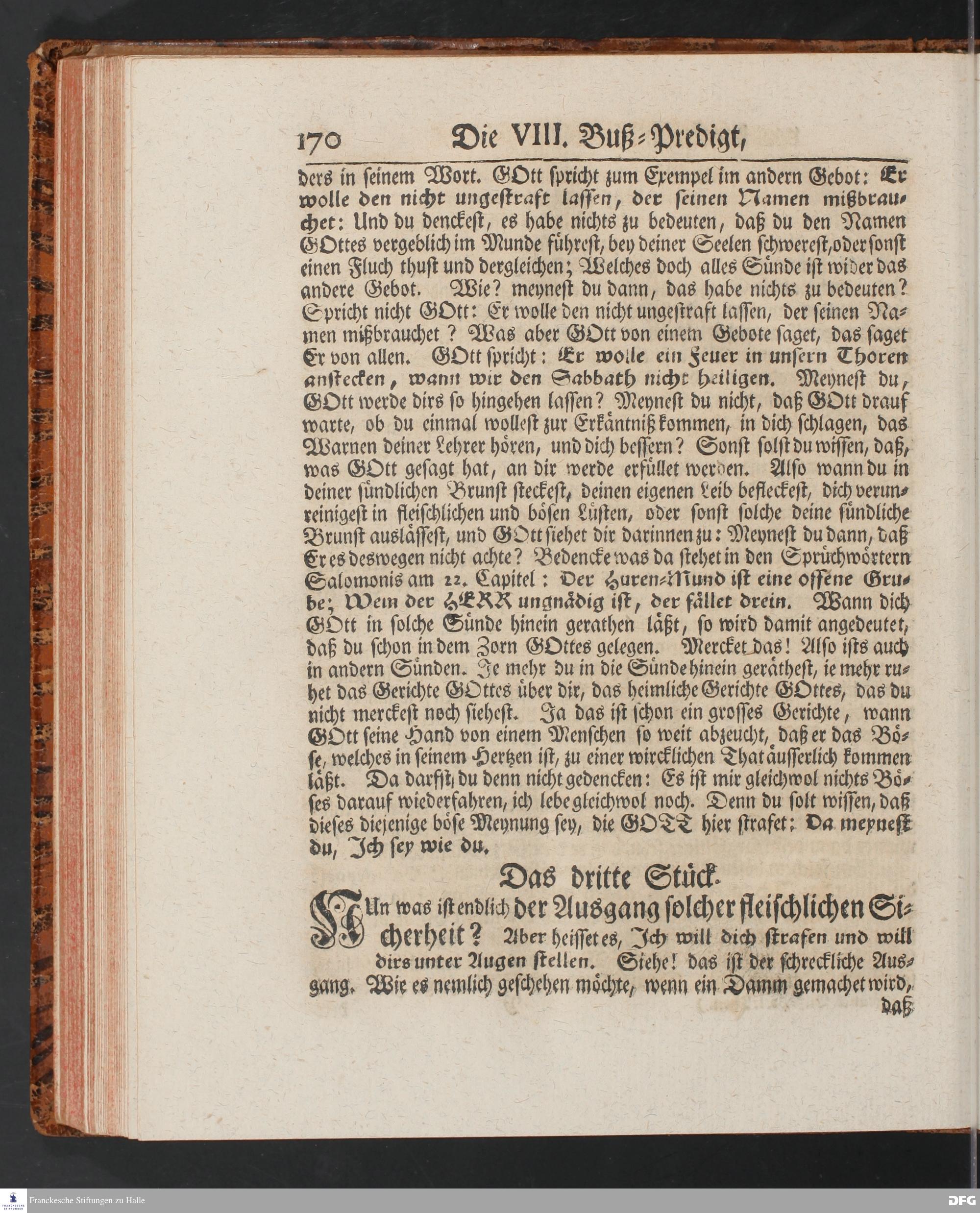 August Hermann Franckens SS.Theol.Prof.Ord.& Past.Vlriciani, Buß=Predigten, Darinnen aus verschiedenen Texten Heil. Schrift deutlich gezeiget wird, Wie nicht nur Unbekehrte zur wahren Busse gelangen, sondern auch die, so bekehret sind, in täglicher Busse und Gottseligkeit leben und wandeln sollen. Erster und Anderer Theil. Fünfte Auflage. Mit Königl. Preuß. und Churfl. Brandenb. Privilegio. HALLE, in Verlegung des Waysenhauses, MDCCXLV.