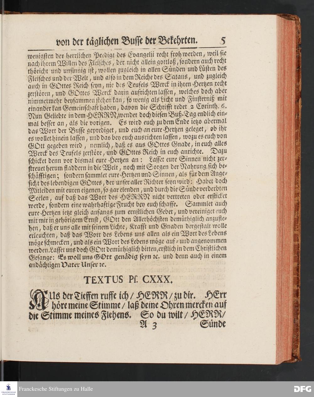August Hermann Franckens SS.Theol.Prof.Ord.& Past.Vlriciani, Buß=Predigten, Darinnen aus verschiedenen Texten Heil. Schrift deutlich gezeiget wird, Wie nicht nur Unbekehrte zur wahren Busse gelangen, sondern auch die, so bekehret sind, in täglicher Busse und Gottseligkeit leben und wandeln sollen. Erster und Anderer Theil. Fünfte Auflage. Mit Königl. Preuß. und Churfl. Brandenb. Privilegio. HALLE, in Verlegung des Waysenhauses, MDCCXLV.
