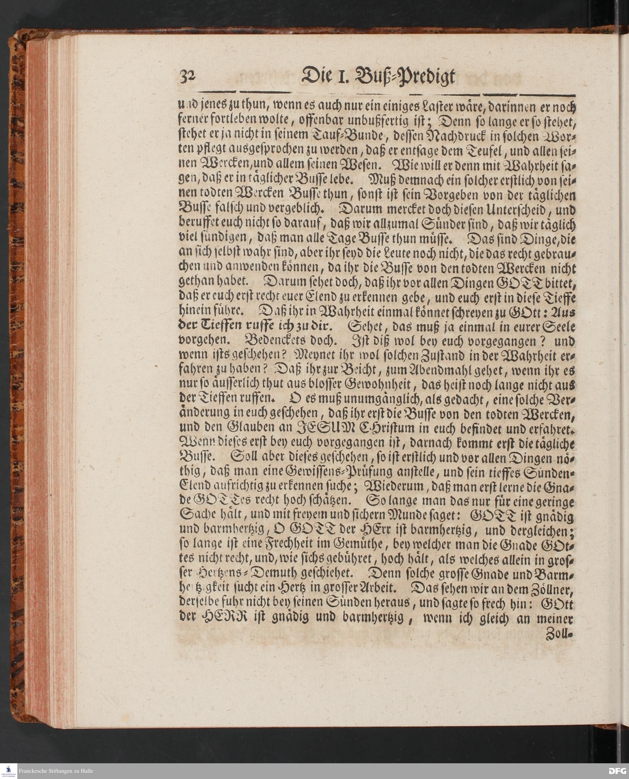 August Hermann Franckens SS.Theol.Prof.Ord.& Past.Vlriciani, Buß=Predigten, Darinnen aus verschiedenen Texten Heil. Schrift deutlich gezeiget wird, Wie nicht nur Unbekehrte zur wahren Busse gelangen, sondern auch die, so bekehret sind, in täglicher Busse und Gottseligkeit leben und wandeln sollen. Erster und Anderer Theil. Fünfte Auflage. Mit Königl. Preuß. und Churfl. Brandenb. Privilegio. HALLE, in Verlegung des Waysenhauses, MDCCXLV.
