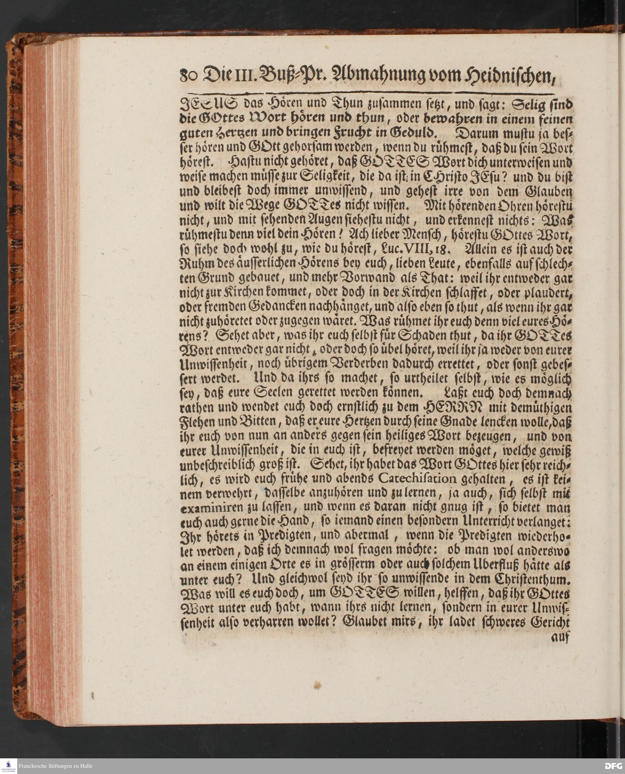 August Hermann Franckens SS.Theol.Prof.Ord.& Past.Vlriciani, Buß=Predigten, Darinnen aus verschiedenen Texten Heil. Schrift deutlich gezeiget wird, Wie nicht nur Unbekehrte zur wahren Busse gelangen, sondern auch die, so bekehret sind, in täglicher Busse und Gottseligkeit leben und wandeln sollen. Erster und Anderer Theil. Fünfte Auflage. Mit Königl. Preuß. und Churfl. Brandenb. Privilegio. HALLE, in Verlegung des Waysenhauses, MDCCXLV.