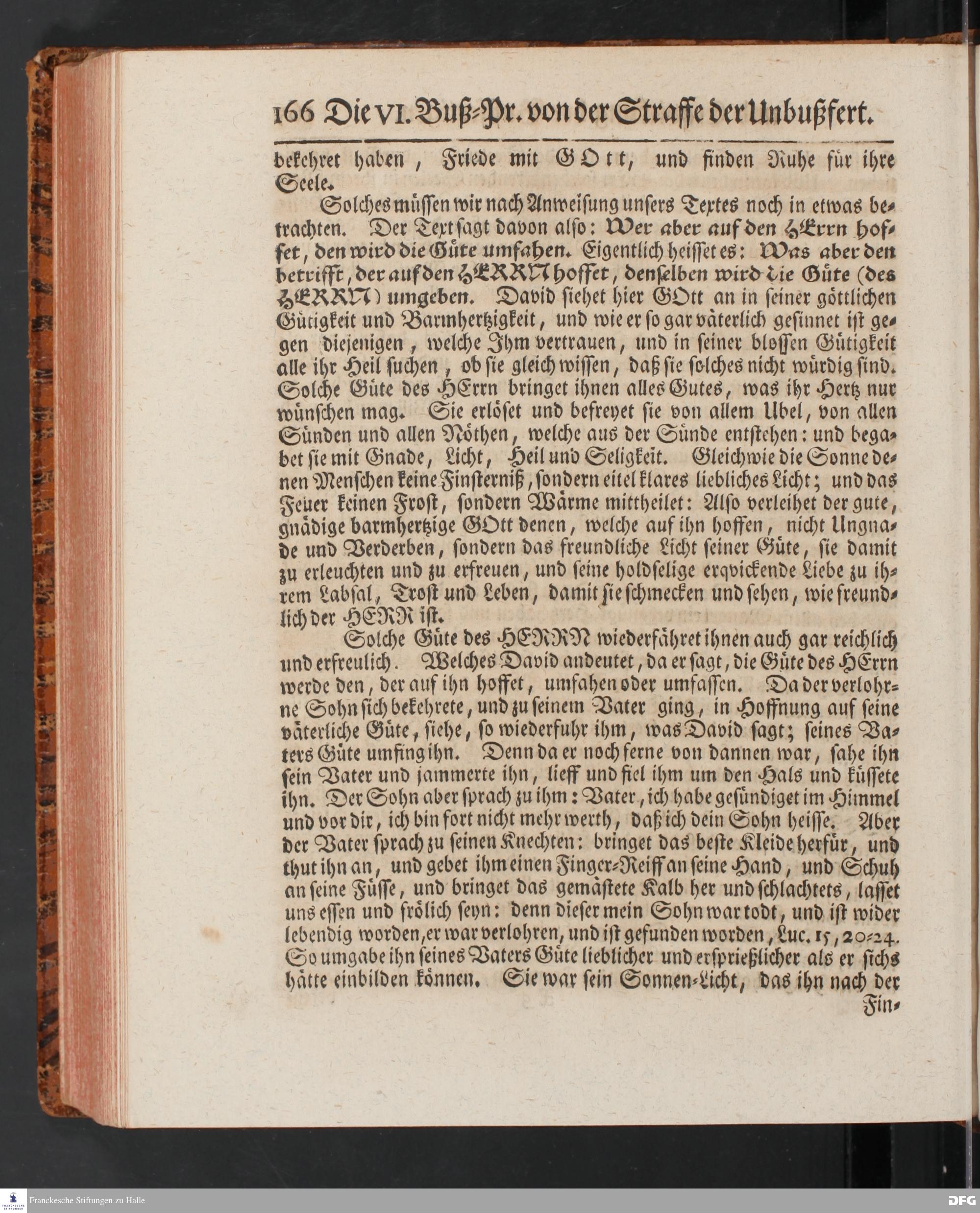 August Hermann Franckens SS.Theol.Prof.Ord.& Past.Vlriciani, Buß=Predigten, Darinnen aus verschiedenen Texten Heil. Schrift deutlich gezeiget wird, Wie nicht nur Unbekehrte zur wahren Busse gelangen, sondern auch die, so bekehret sind, in täglicher Busse und Gottseligkeit leben und wandeln sollen. Erster und Anderer Theil. Fünfte Auflage. Mit Königl. Preuß. und Churfl. Brandenb. Privilegio. HALLE, in Verlegung des Waysenhauses, MDCCXLV.
