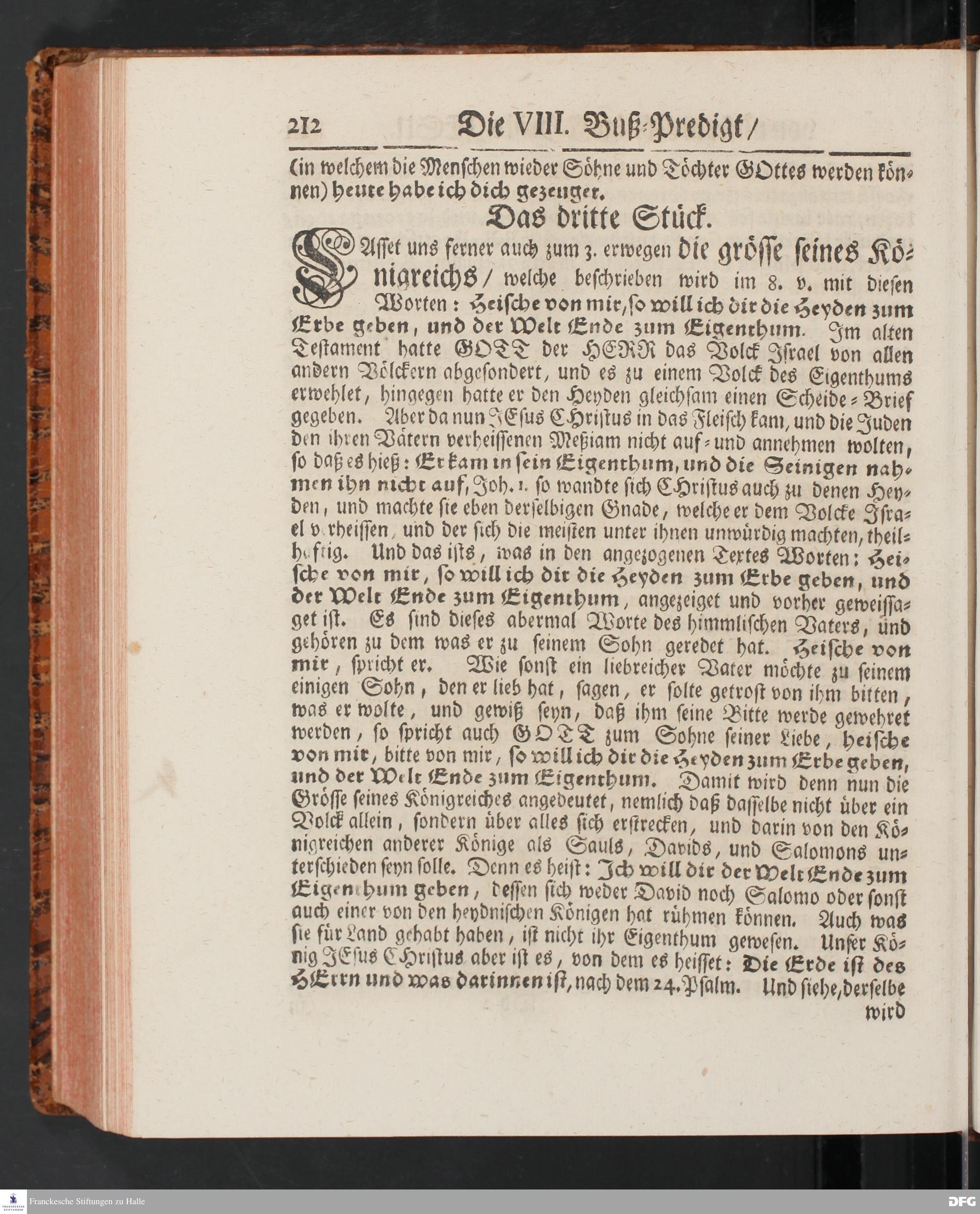 August Hermann Franckens SS.Theol.Prof.Ord.& Past.Vlriciani, Buß=Predigten, Darinnen aus verschiedenen Texten Heil. Schrift deutlich gezeiget wird, Wie nicht nur Unbekehrte zur wahren Busse gelangen, sondern auch die, so bekehret sind, in täglicher Busse und Gottseligkeit leben und wandeln sollen. Erster und Anderer Theil. Fünfte Auflage. Mit Königl. Preuß. und Churfl. Brandenb. Privilegio. HALLE, in Verlegung des Waysenhauses, MDCCXLV.