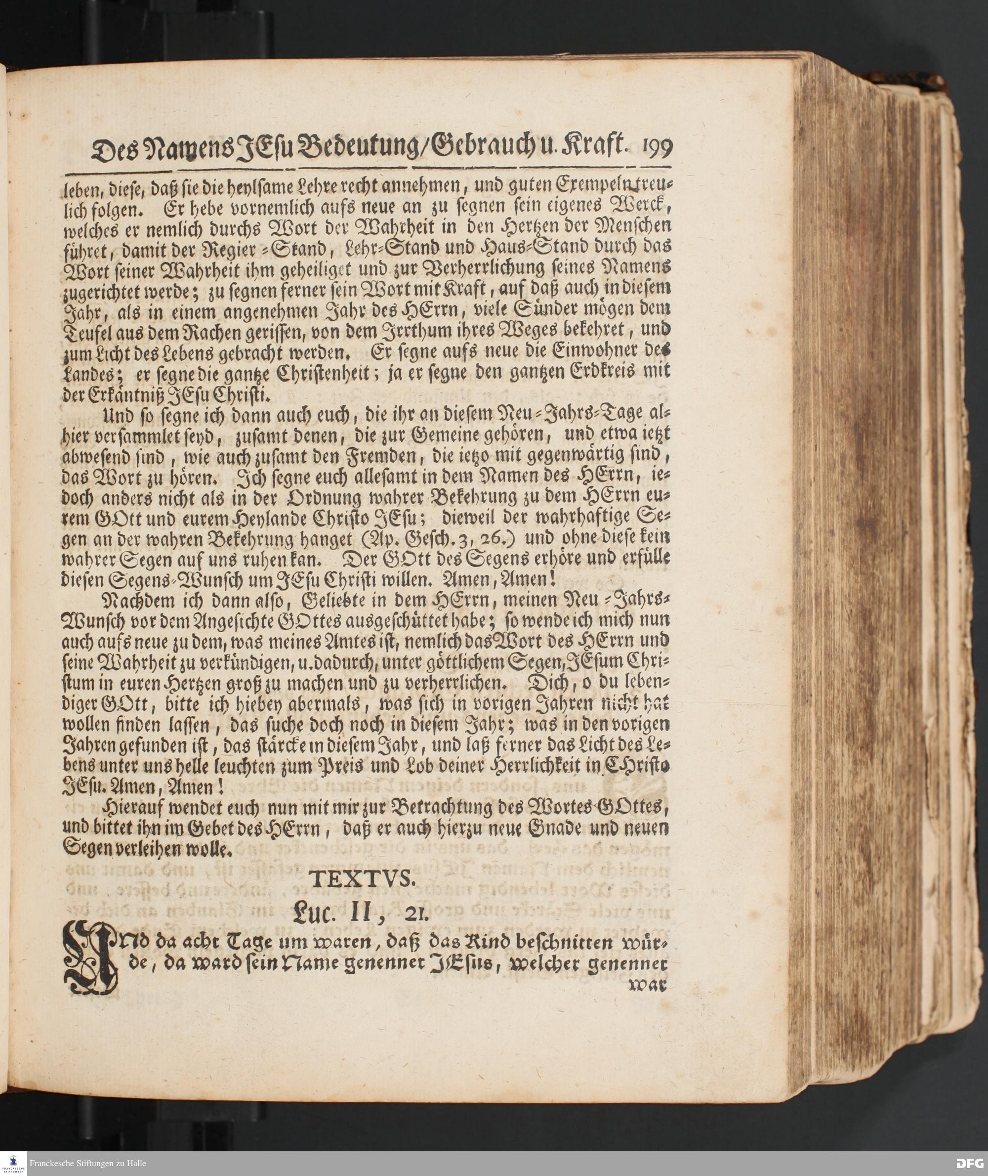 Des Namens JESU herrliche Bedeutung / rechter Gebrauch / wie auch Segens=und Lebens=volle Kraft. [Predigt] Am Neuen=Jahrs=Tage.