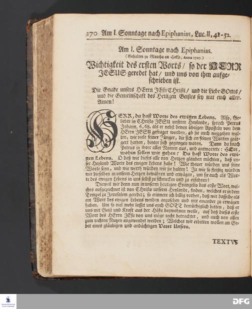 Wichtigkeit des ersten Worts / so der HERR JESU geredet hat / und uns von ihm aufgeschrieben ist. [Predigt] Am I. Sonntage nach Epiphanias.