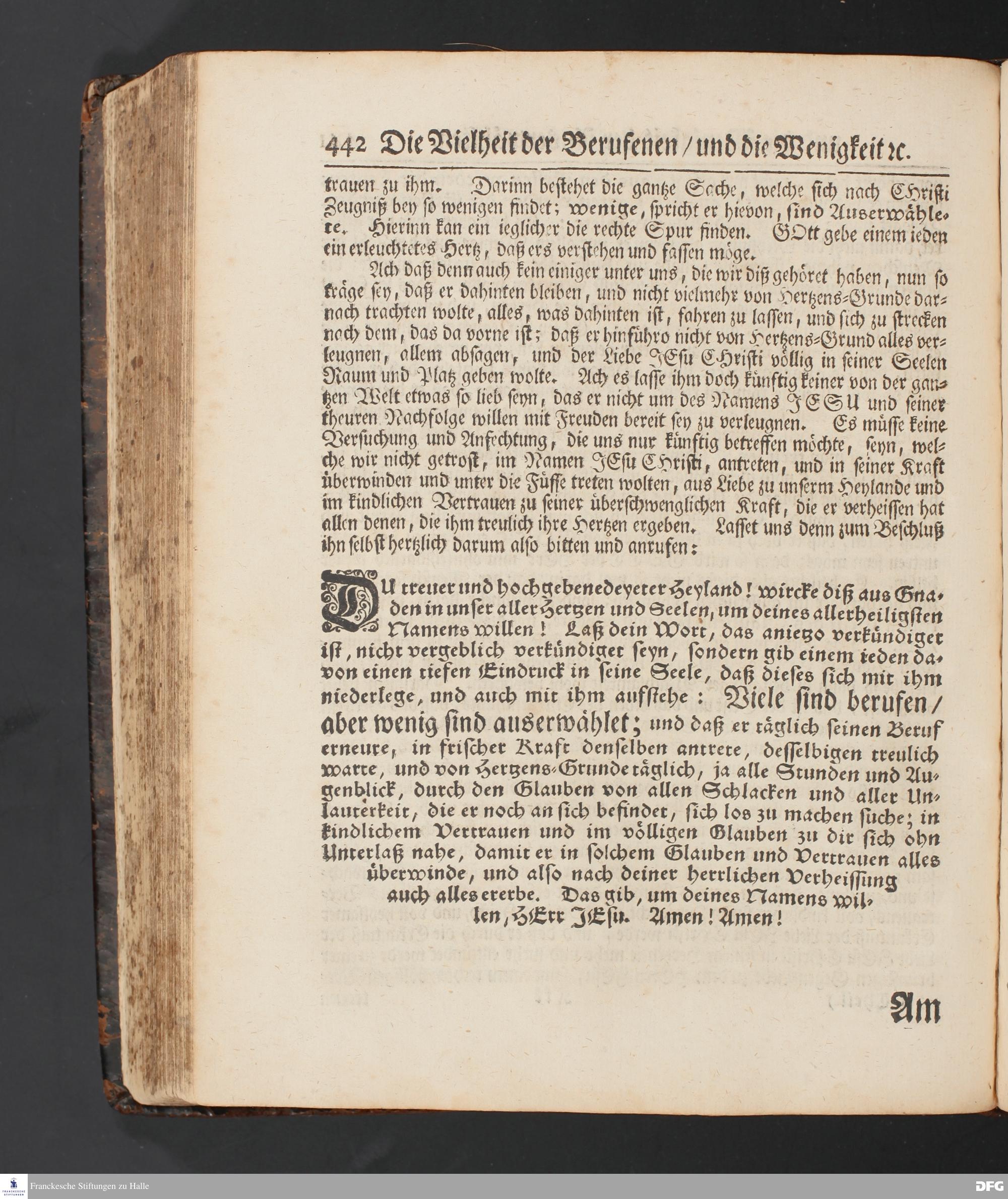 Die Vielheit der Berufenen Und Wenigkeit der Auserwählten / Aus dem Evangelischen Text Matth.XXII, 1-14. Am XX.Sonntag nach Trinitatis MDCCXV [vielmehr MDCCXVI]. In der St.Ulrichs=Kirchen in Halle vorgestellet von August Hermann Francken / S.Theol.Prof.& Past.zu S.Ulrich, und des Gymnasii Scholarcha. HALLE, Gedruckt und zu finden im Wäysen=Hause, 1716.