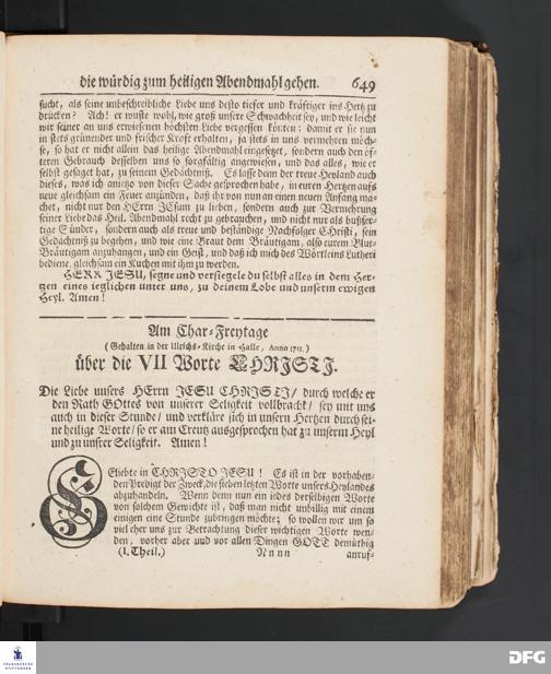 Über die VII Worte CHRISTI. [Predigt] Am Char=Freytage. (Gehalten in der Ulrichs=Kirche...