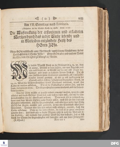 Die Aufweckung der erstorbenen und erkalteten Hertzen durch das in der Liebe lebende und in Mitleiden entzündete Hertz des HErrn JEsu. [Predigt] Am VII. Sonntage nach Trinitatis.