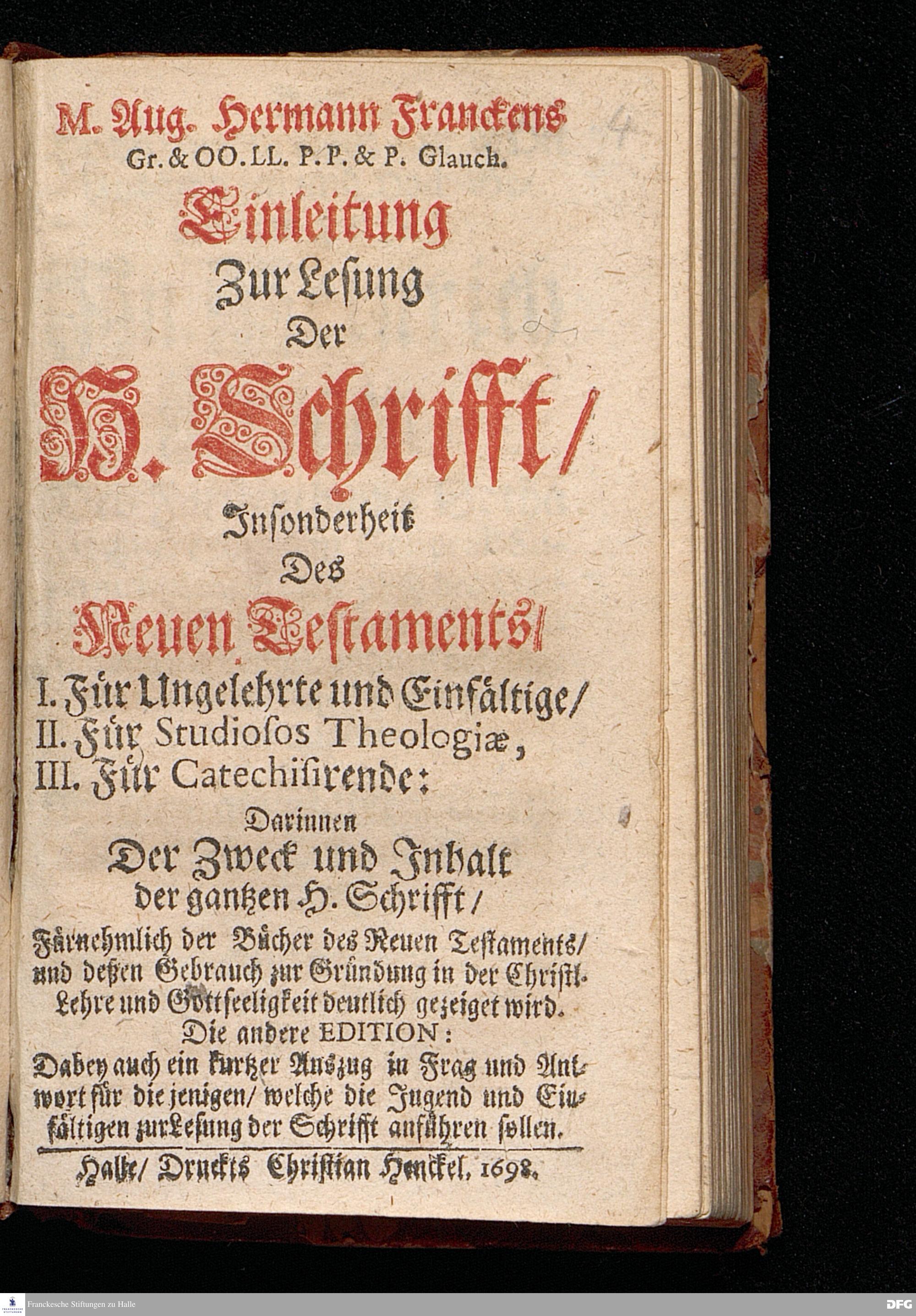 M. Aug. Hermann Franckens Gr.& OO.LL.P.P. & P.Glauch. Einleitung Zur Lesung Der H. Schrifft / Insonderheit Des Neuen Testaments / I. Für Ungelehrte und Einfältige / II. Für Studiosos Theologiæ, III. Für Catechisirende: Darinnen Der Zweck und Inhalt der gantzen H.Schrifft / Fürnehmlich der Bücher des Neuen Testaments / und deßen Gebrauch zur Gründung in der Christl. Lehre und Gottseeligkeit deutlich gezeiget wird. Die andere EDITION: Dabey auch ein kurtzer Auszug in Frag und Antwort für die jenigen / welche die Jugend und Einfältigen zur Lesung der Schrifft anführen sollen. Halle / Druckts Christian Henckel. 1698.