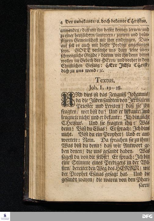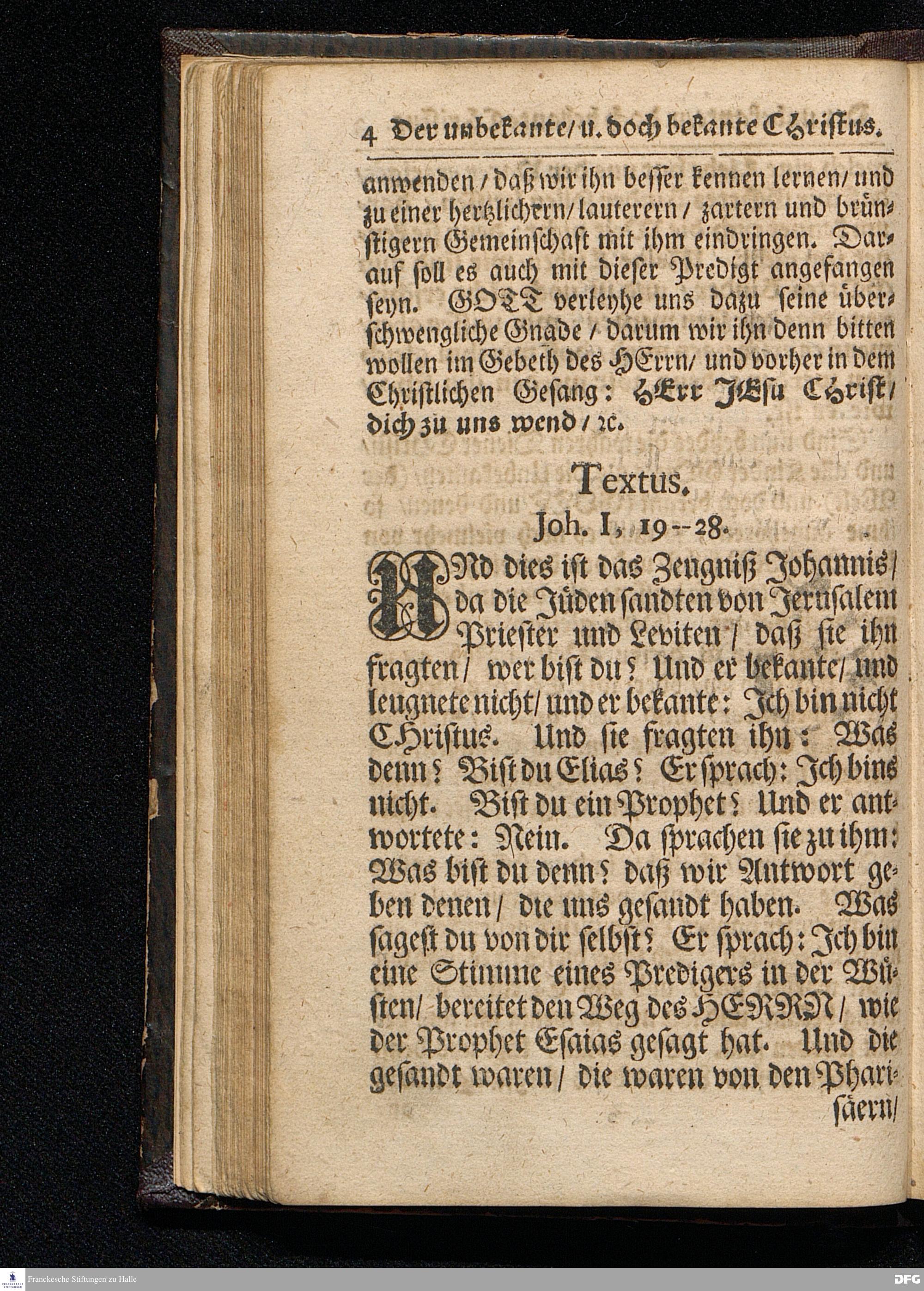 Der unbekante / und doch bekante Christus / Aus dem Evangelischen Text Joh.I, 19-28. Am IV.Sonntag des Advents 1715. In der St.Ulrichs=Kirchen in Halle / vorgestellet von A[ugust] H[ermann] F[rancke]. [Kopftitel]