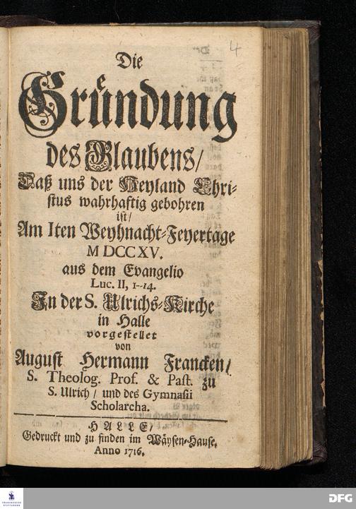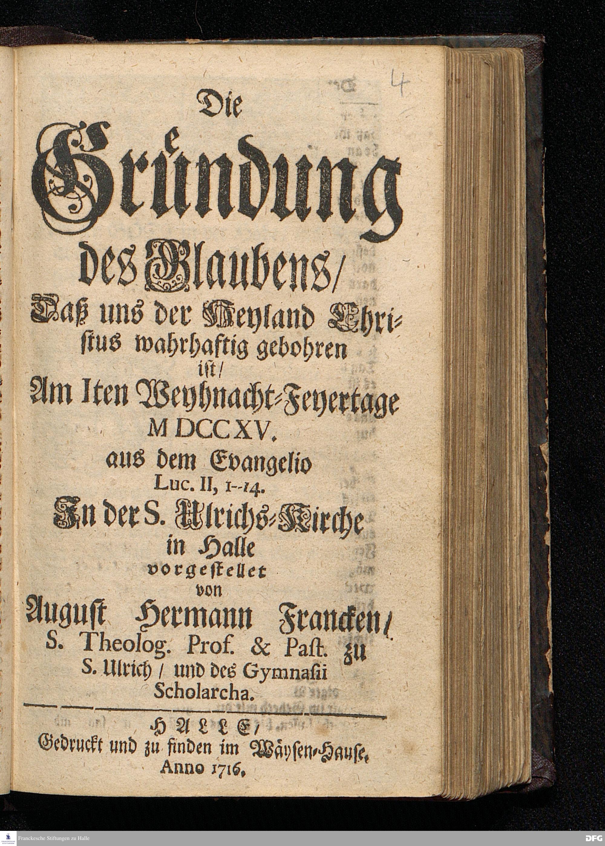 Die Gründung des Glaubens / Daß uns der Heyland Christus wahrhaftig gebohren ist / Am Iten Weynacht=Feyertage MDCCXV. aus dem Evangelio Luc.II, 1--14. In der S.Ulrichs=Kirche in Halle vorgestellet von August Hermann Francken / S.Theolog.Prof.& Past.zu S.Ulrich / und des Gymnasii Scholarcha. HALLE / Gedruckt und zu finden im Wäysen=Hause, Anno 1716.