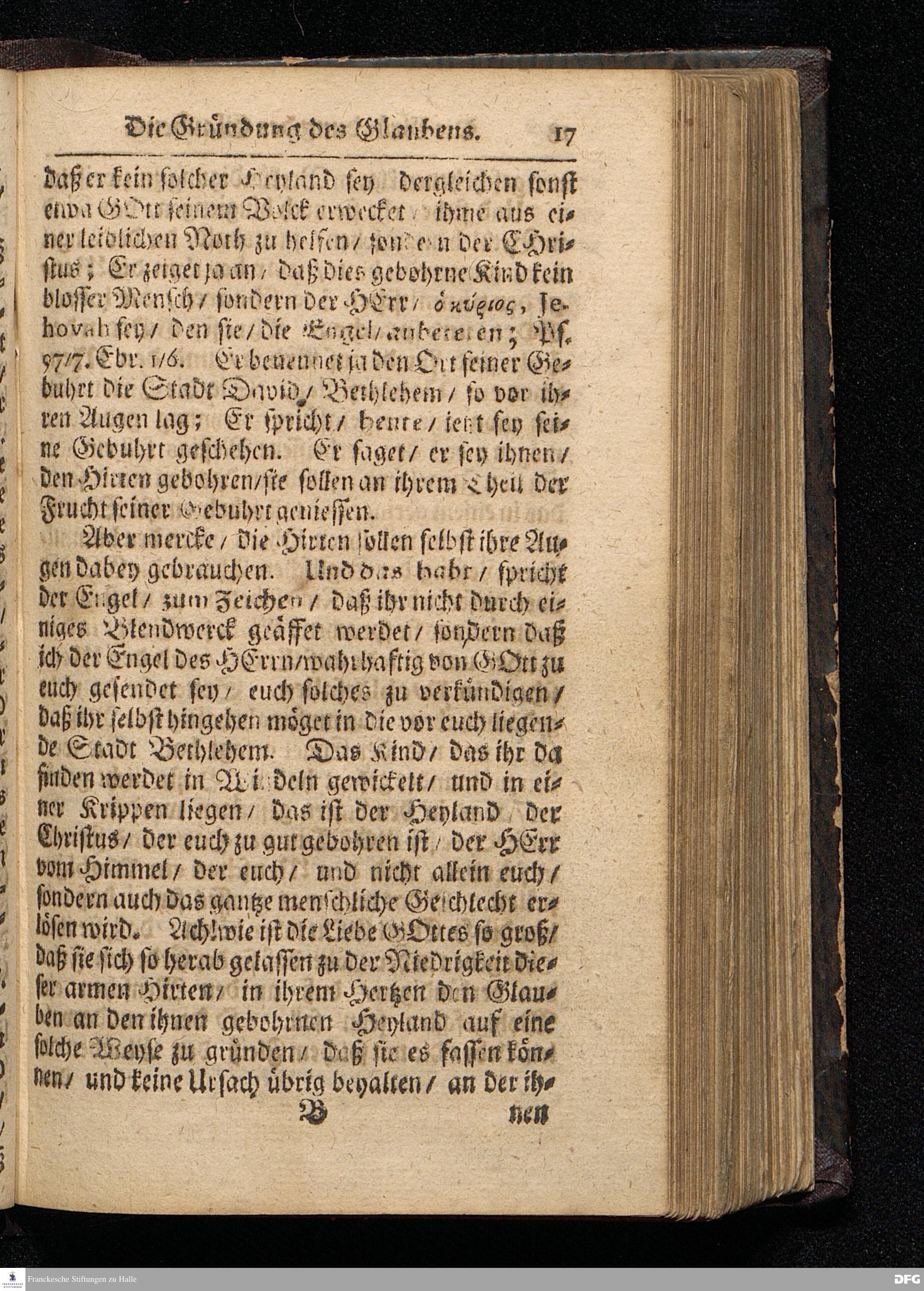 Die Gründung des Glaubens / Daß uns der Heyland Christus wahrhaftig gebohren ist / Am Iten Weynacht=Feyertage MDCCXV. aus dem Evangelio Luc.II, 1--14. In der S.Ulrichs=Kirche in Halle vorgestellet von August Hermann Francken / S.Theolog.Prof.& Past.zu S.Ulrich / und des Gymnasii Scholarcha. HALLE / Gedruckt und zu finden im Wäysen=Hause, Anno 1716.