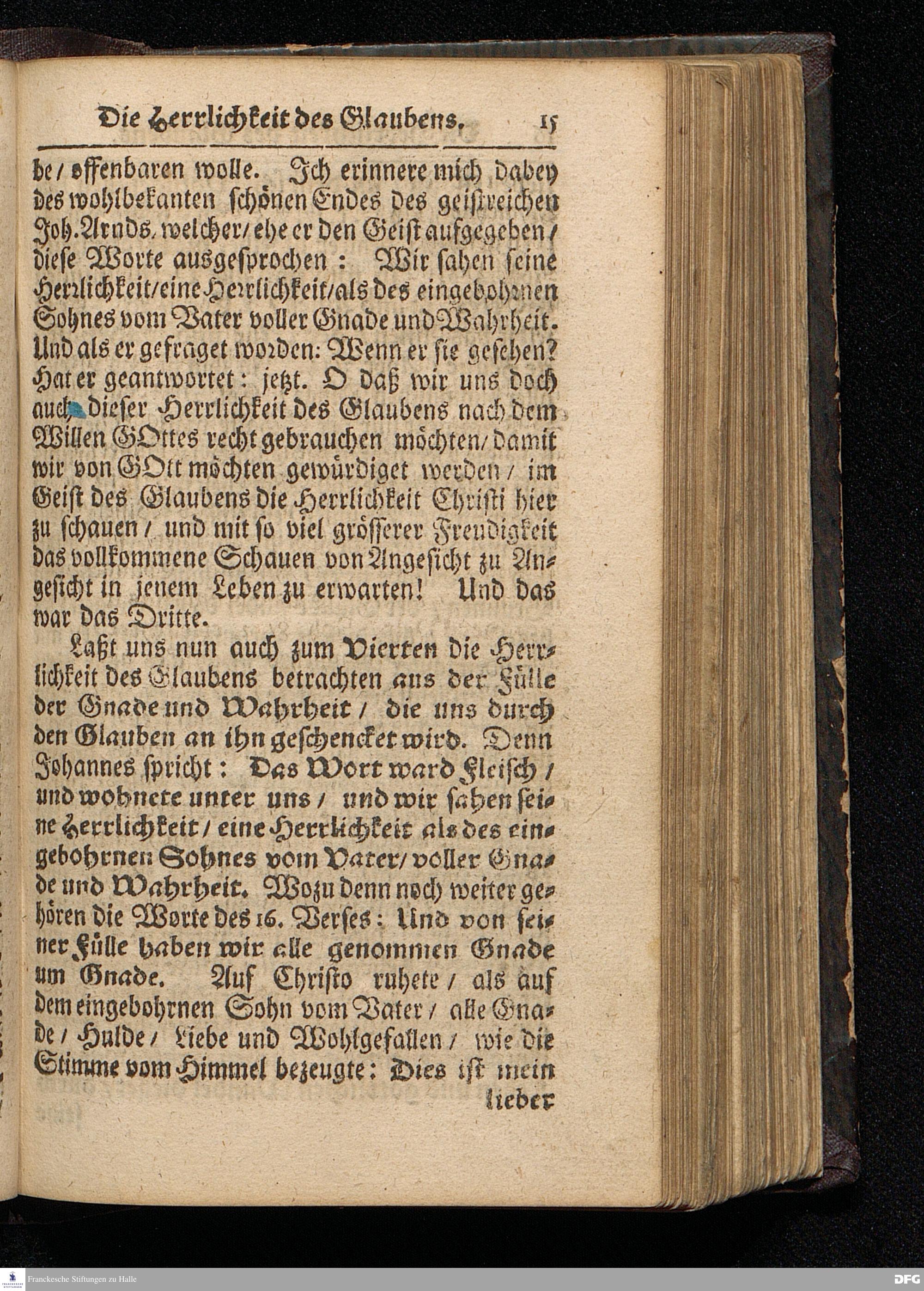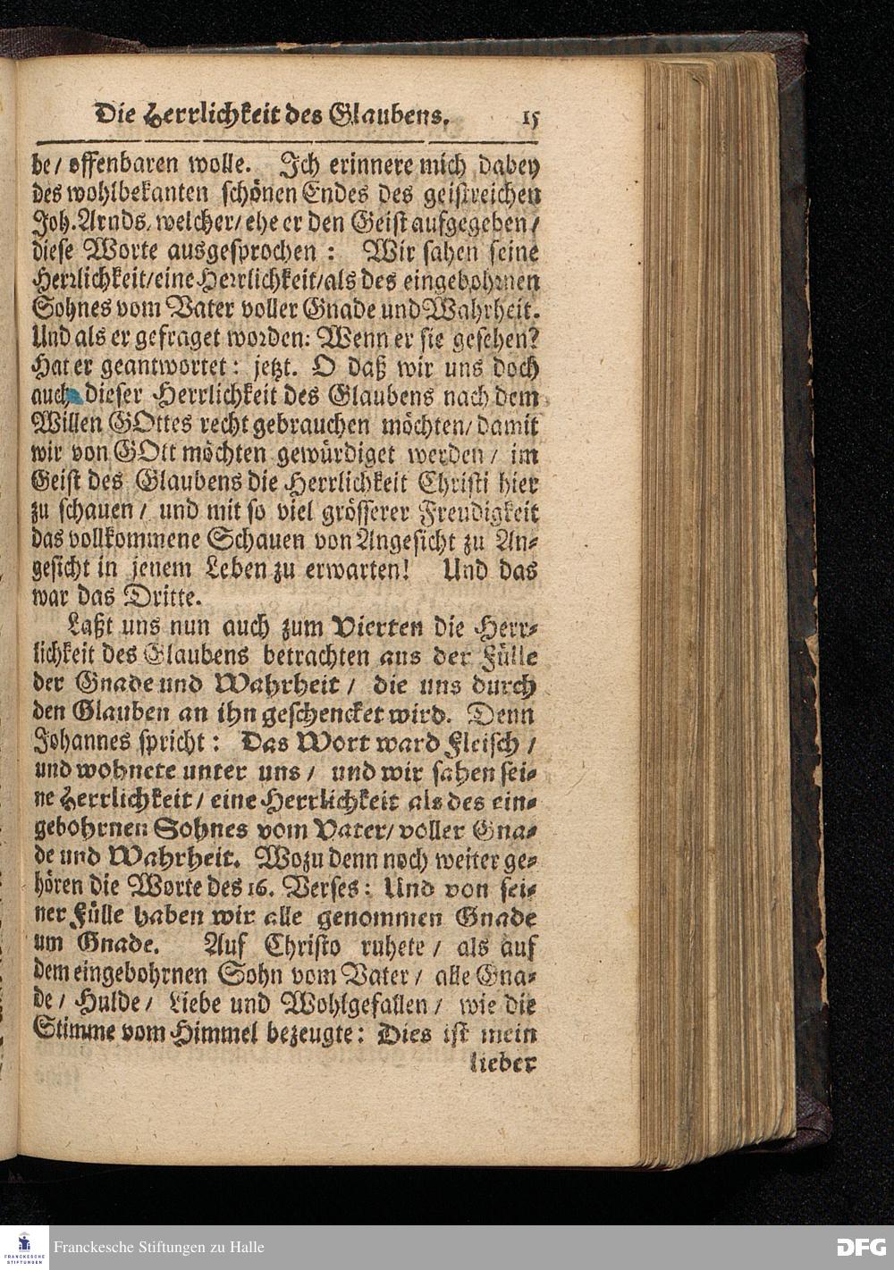 Die Herrlichkeit des Glaubens / Am 3ten Weyhnacht=Feyertage MDCCXV. In der Predigt aus dem Evangelio Ioh. I,1--14. In der Schul=Kirche zu Halle vorgestellet von August Hermann Francken / S.Theolog.Prof.& Past.zu S.Ulrich / und des Gymnasii Scholarcha. HALLE / Gedruckt und zu finden im Wäysen=Hause. Anno 1716.