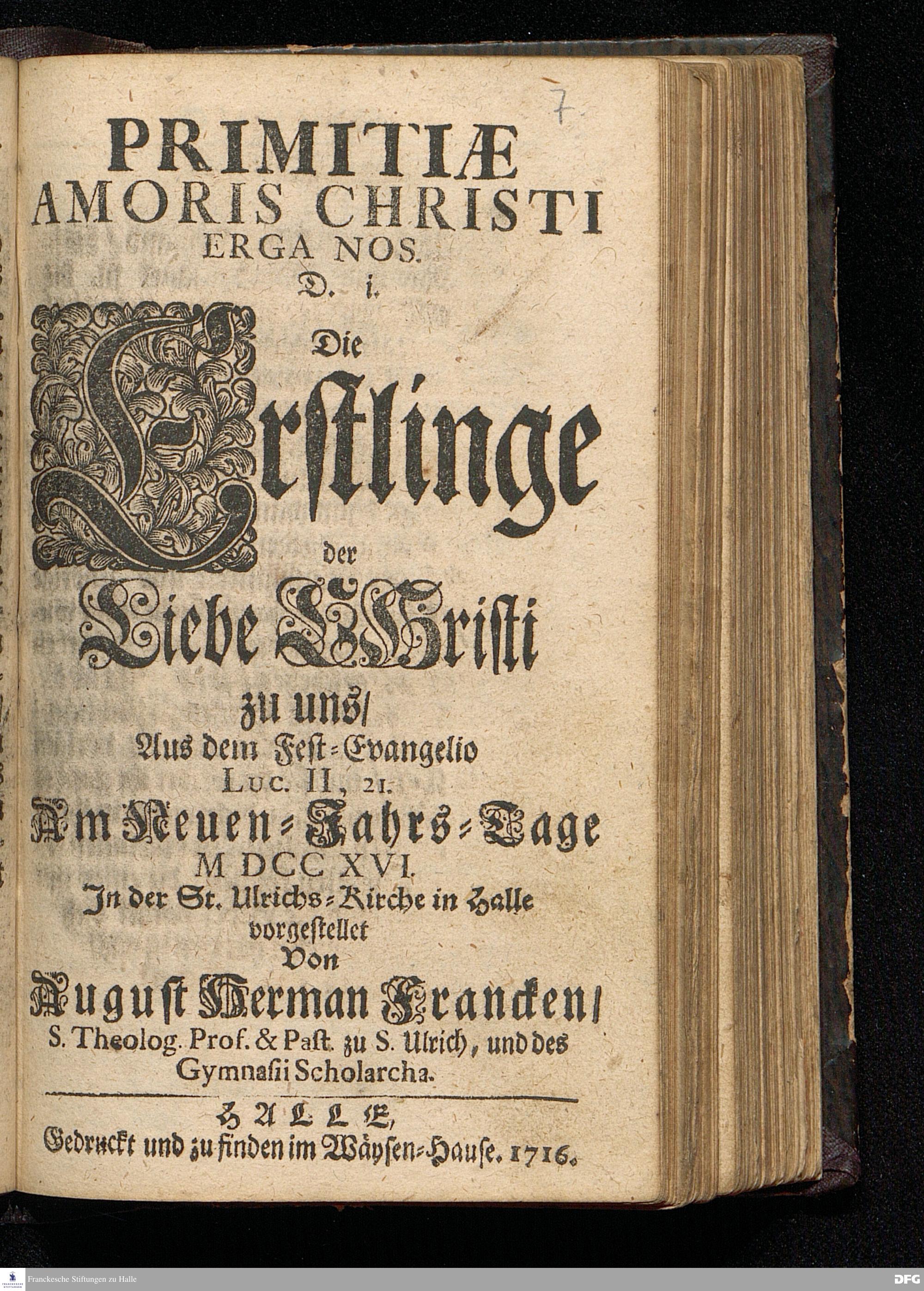 PRIMITIAE AMORIS CHRISTI ERGA NOS. D.i. Die Erstlinge der Liebe CHristi zu uns / Aus dem Fest=Evangelio Luc.II, 21. Am Neuen=Jahrs=Tage MDCCXVI. In der St.Ulrichs=Kirche in Halle vorgestellet Von August Herman[n] Francken / S.Theolog.Prof.& Past. zu S.Ulrich, und des Gymnasii Scholarcha. HALLE, Gedruckt und zu finden im Wäysen=Hause. 1716.