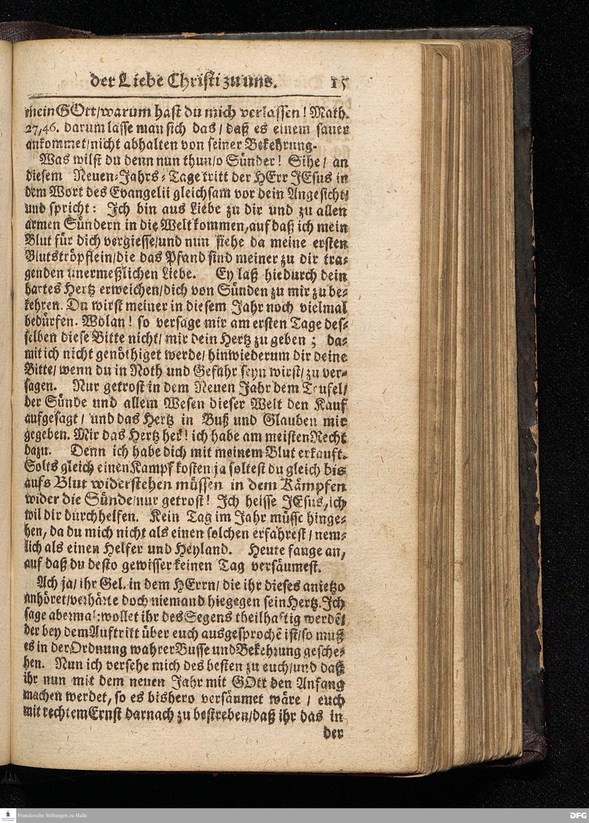PRIMITIAE AMORIS CHRISTI ERGA NOS. D.i. Die Erstlinge der Liebe CHristi zu uns / Aus dem Fest=Evangelio Luc.II, 21. Am Neuen=Jahrs=Tage MDCCXVI. In der St.Ulrichs=Kirche in Halle vorgestellet Von August Herman[n] Francken / S.Theolog.Prof.& Past. zu S.Ulrich, und des Gymnasii Scholarcha. HALLE, Gedruckt und zu finden im Wäysen=Hause. 1716.
