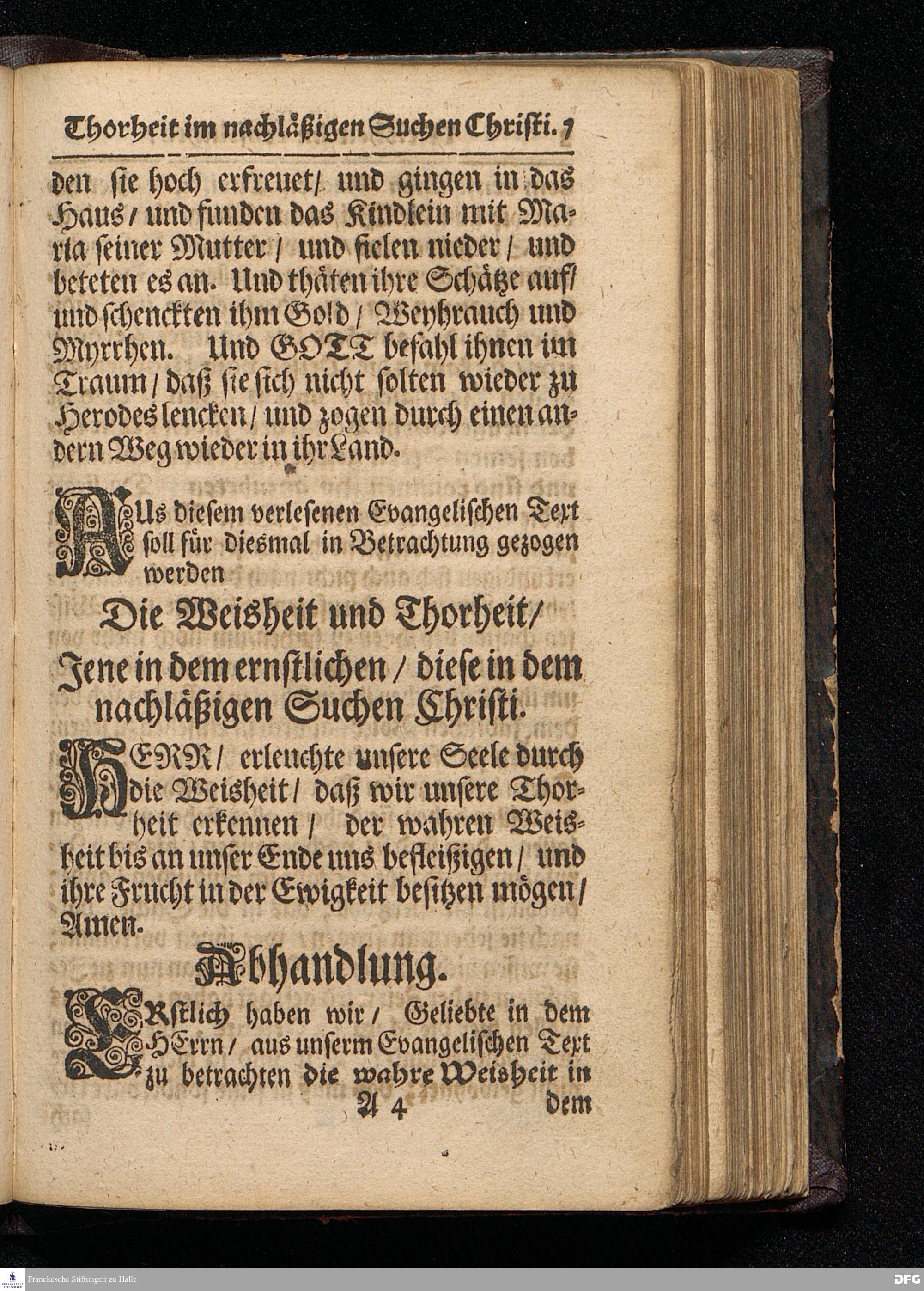 Die Weisheit und Thorheit / Jene in dem ernstlichen / diese in dem nachläßigen Suchen Christi / Aus dem Fest=Evangelio Matth.II, 1--12. Am H.3.König=Tage In der St.Ulrichs=Kirche zu Halle vorgestellet von August Herman[n] Francken / S.Theolog.Prof.& Past.zu S.Ulrich / und des Gymnasii Scholarcha. HALLE / Gedruckt und zu finden im Wäysen=Hause. Anno 1716.