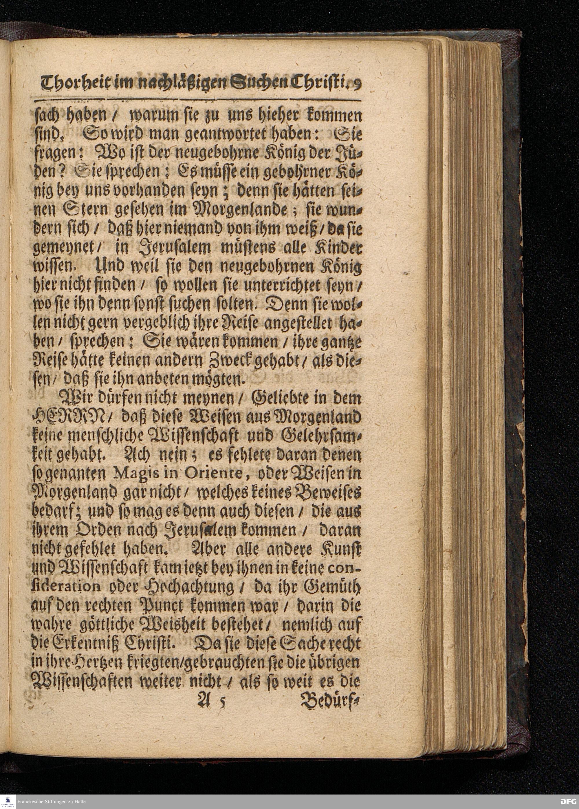Die Weisheit und Thorheit / Jene in dem ernstlichen / diese in dem nachläßigen Suchen Christi / Aus dem Fest=Evangelio Matth.II, 1--12. Am H.3.König=Tage In der St.Ulrichs=Kirche zu Halle vorgestellet von August Herman[n] Francken / S.Theolog.Prof.& Past.zu S.Ulrich / und des Gymnasii Scholarcha. HALLE / Gedruckt und zu finden im Wäysen=Hause. Anno 1716.
