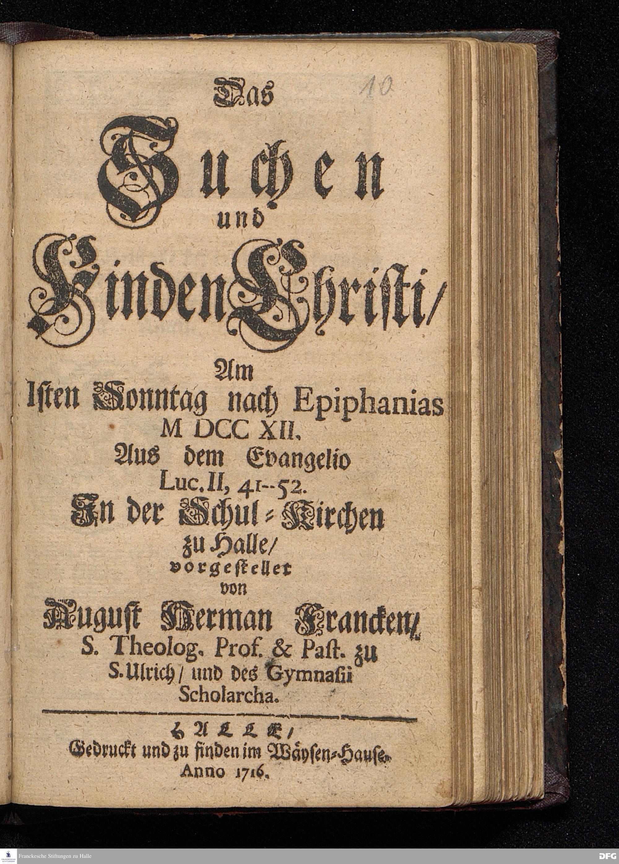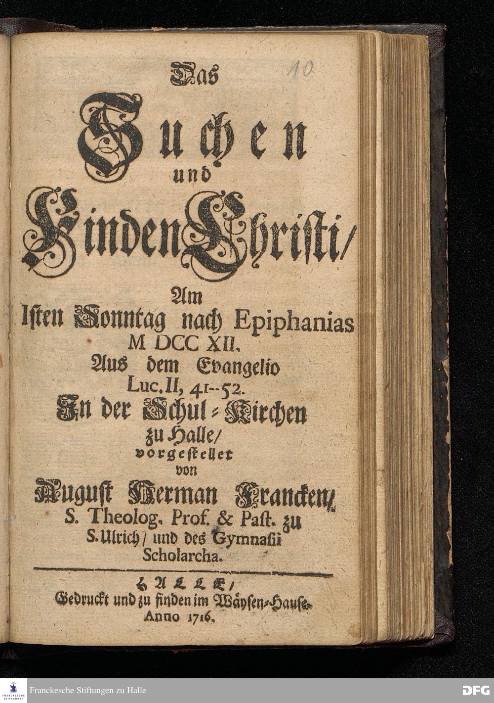 Das Suchen und Finden Christi / Am 1sten Sonntag nach Epiphanias MDCCXII. Aus dem Evangelio Luc.II, 41-52. In der Schul=Kirchen zu Halle / vorgestellet von August Herman[n] Francken / S.Theolog.Prof.& Past.zu S.Ulrich / und des Gymnasii Scholarcha. HALLE / Gedruckt und zu finden im Wäysen=Hause. Anno 1716.