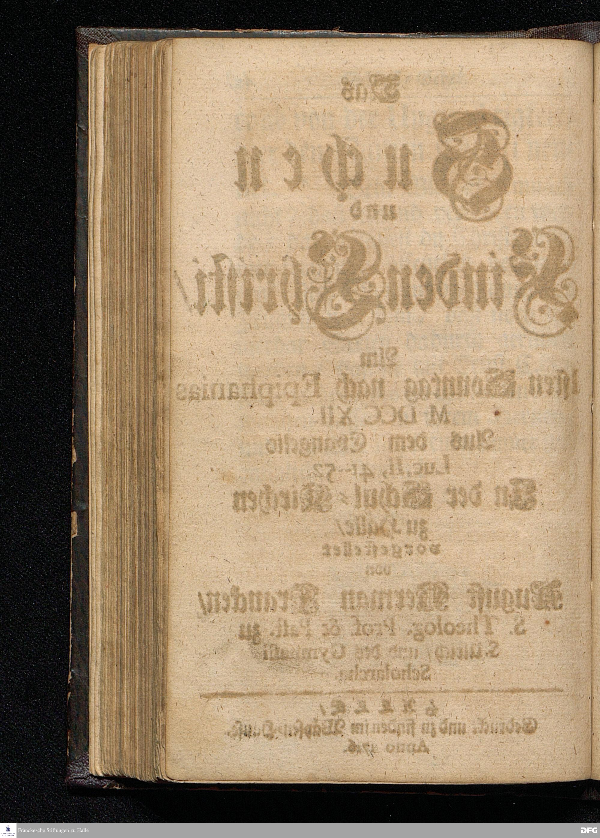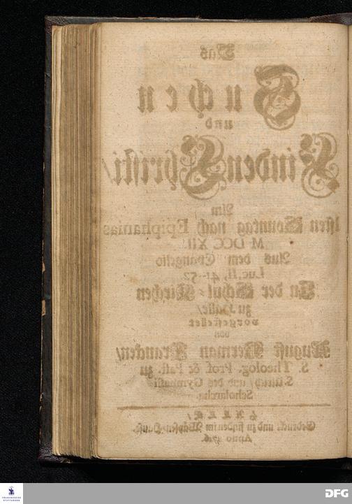 Das Suchen und Finden Christi / Am 1sten Sonntag nach Epiphanias MDCCXII. Aus dem Evangelio Luc.II, 41-52. In der Schul=Kirchen zu Halle / vorgestellet von August Herman[n] Francken / S.Theolog.Prof.& Past.zu S.Ulrich / und des Gymnasii Scholarcha. HALLE / Gedruckt und zu finden im Wäysen=Hause. Anno 1716.