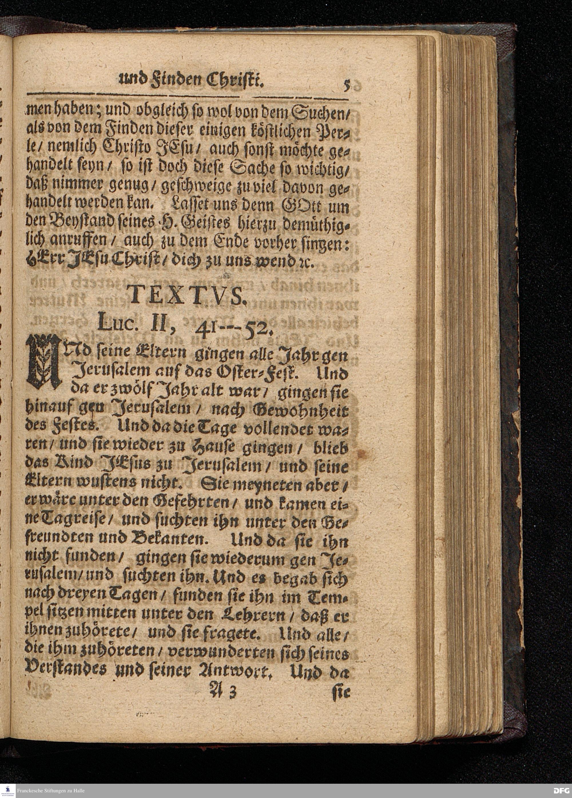 Das Suchen und Finden Christi / Am 1sten Sonntag nach Epiphanias MDCCXII. Aus dem Evangelio Luc.II, 41-52. In der Schul=Kirchen zu Halle / vorgestellet von August Herman[n] Francken / S.Theolog.Prof.& Past.zu S.Ulrich / und des Gymnasii Scholarcha. HALLE / Gedruckt und zu finden im Wäysen=Hause. Anno 1716.