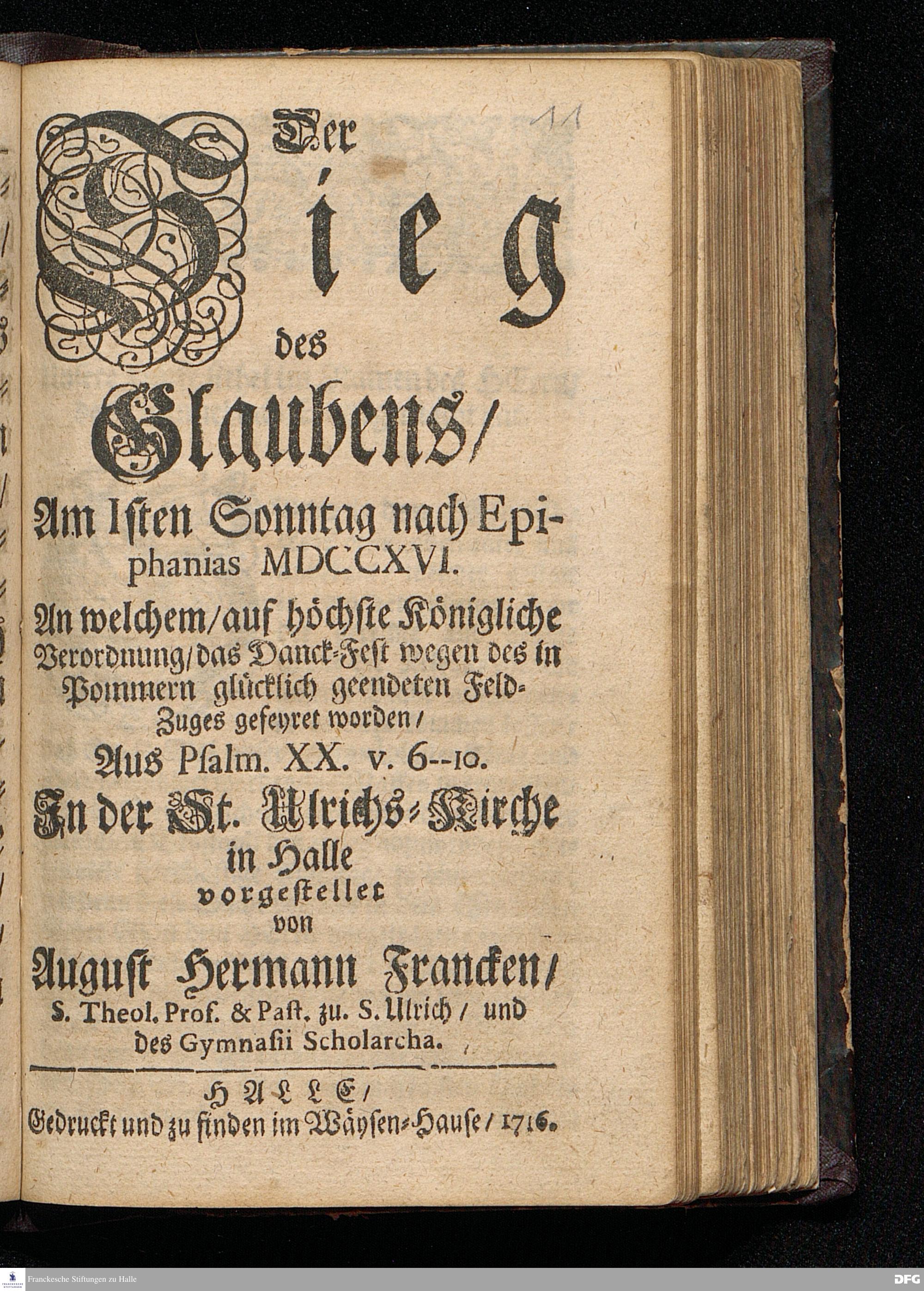 Der Sieg des Glaubens / Am Isten Sonntag nach Epiphanias MDCCXVI. An welchem / auf höchste Königliche Verordnung / das Danck=Fest wegen des in Pommern glücklich geendeten Feld=Zuges gefeyret worden / Aus Psalm.XX. v.6--10. In der St.Ulrichs=Kirche in Halle vorgestellet von August Hermann Francken / S.Theol.Prof.& Past.zu S.Ulrich / und des Gymnasii Scholarcha. HALLE / Gedruckt und zu finden im Wäysen=Hause / 1716.