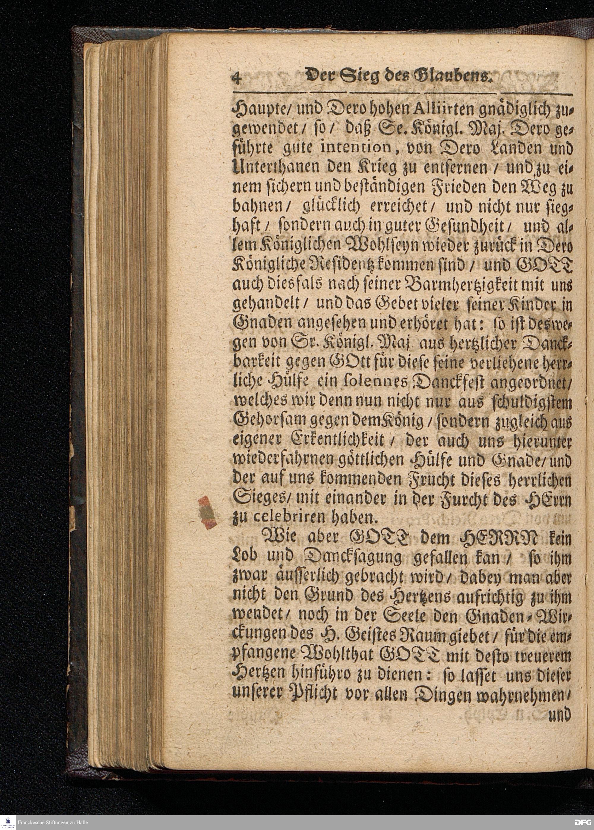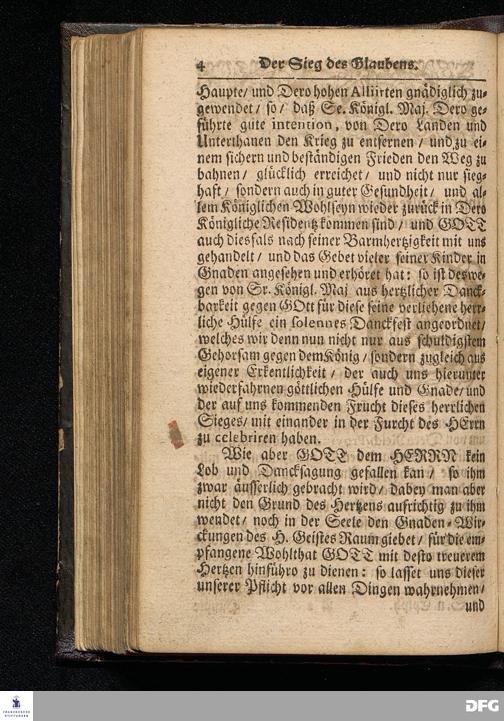 Der Sieg des Glaubens / Am Isten Sonntag nach Epiphanias MDCCXVI. An welchem / auf höchste Königliche Verordnung / das Danck=Fest wegen des in Pommern glücklich geendeten Feld=Zuges gefeyret worden / Aus Psalm.XX. v.6--10. In der St.Ulrichs=Kirche in Halle vorgestellet von August Hermann Francken / S.Theol.Prof.& Past.zu S.Ulrich / und des Gymnasii Scholarcha. HALLE / Gedruckt und zu finden im Wäysen=Hause / 1716.
