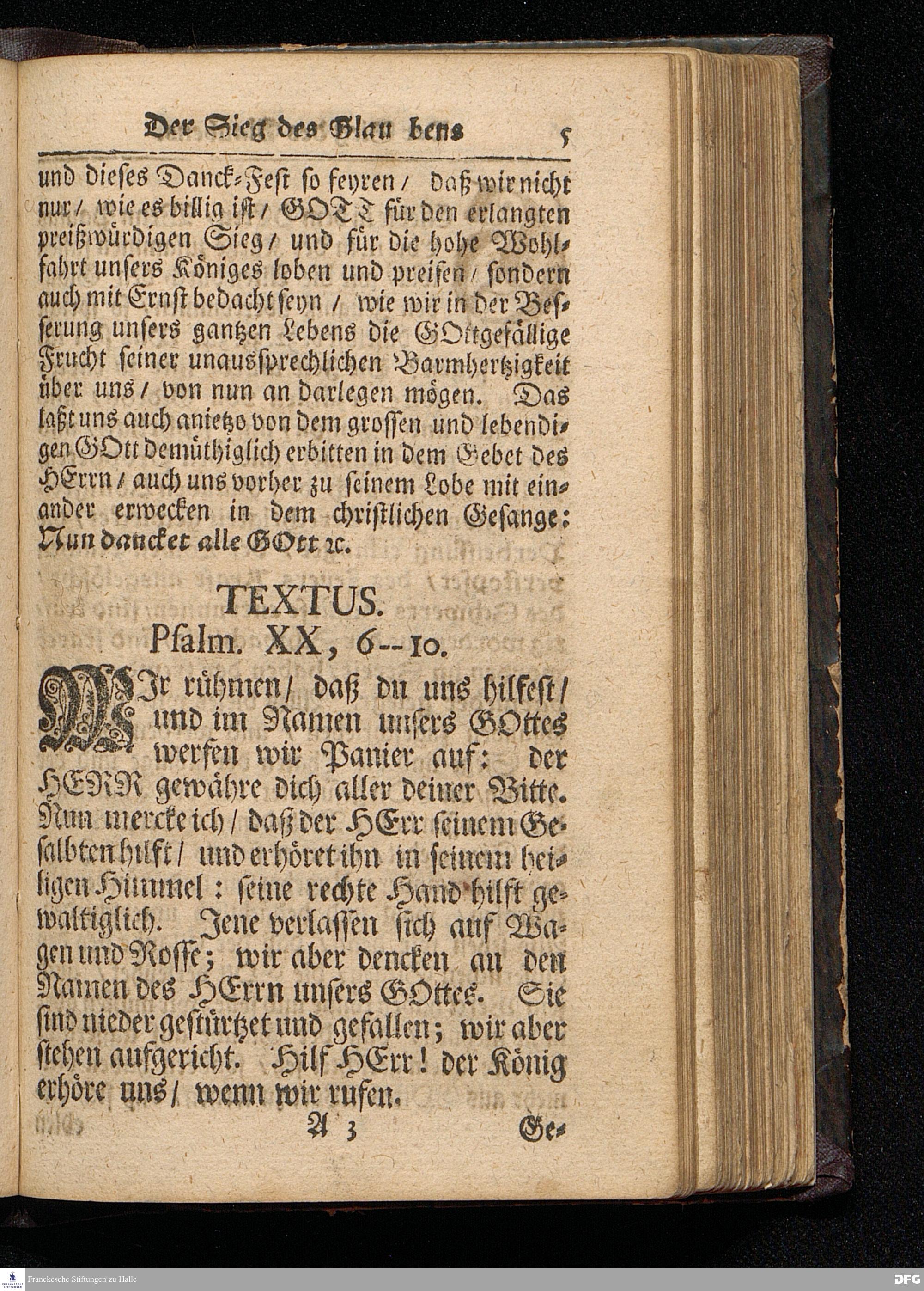 Der Sieg des Glaubens / Am Isten Sonntag nach Epiphanias MDCCXVI. An welchem / auf höchste Königliche Verordnung / das Danck=Fest wegen des in Pommern glücklich geendeten Feld=Zuges gefeyret worden / Aus Psalm.XX. v.6--10. In der St.Ulrichs=Kirche in Halle vorgestellet von August Hermann Francken / S.Theol.Prof.& Past.zu S.Ulrich / und des Gymnasii Scholarcha. HALLE / Gedruckt und zu finden im Wäysen=Hause / 1716.