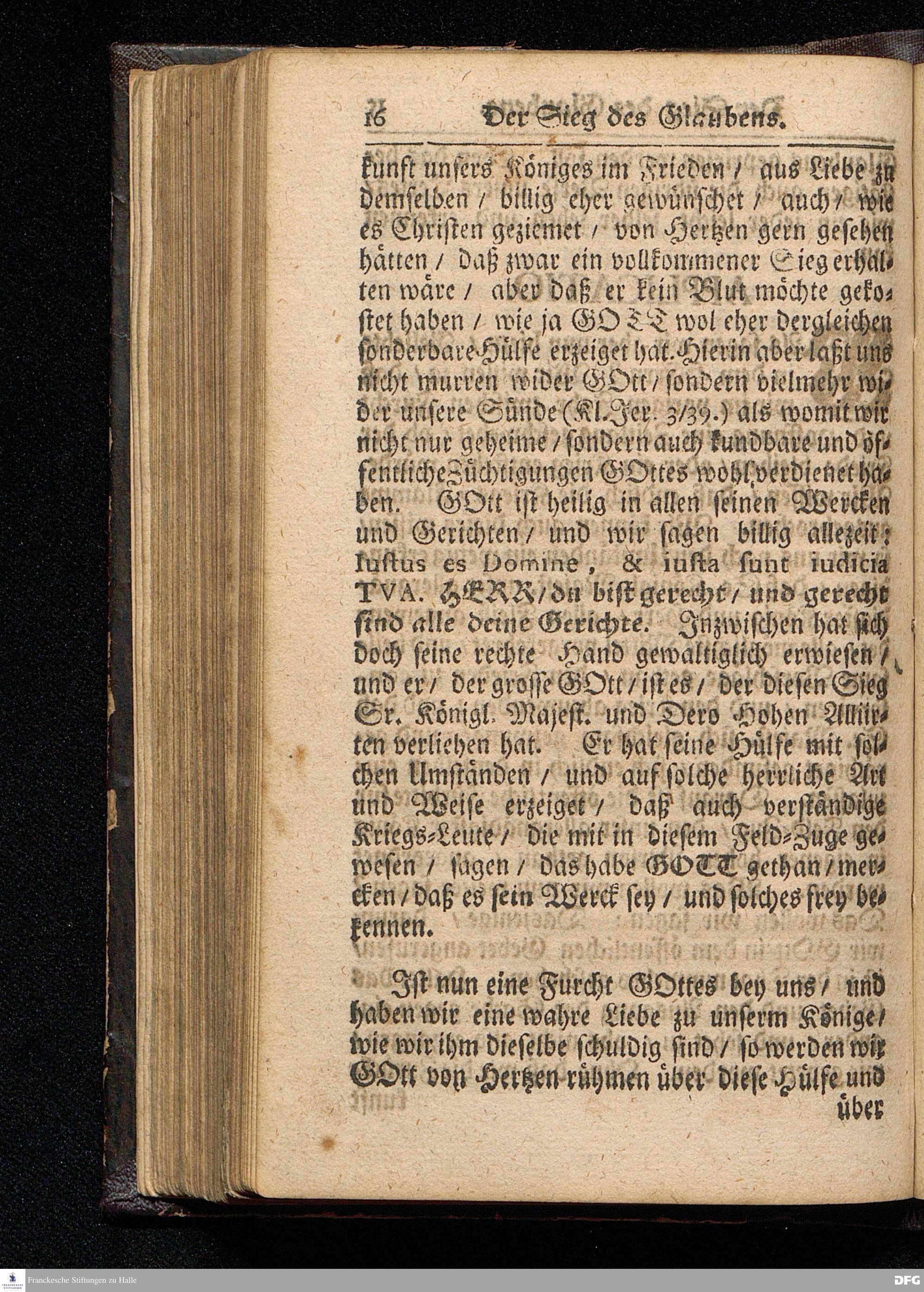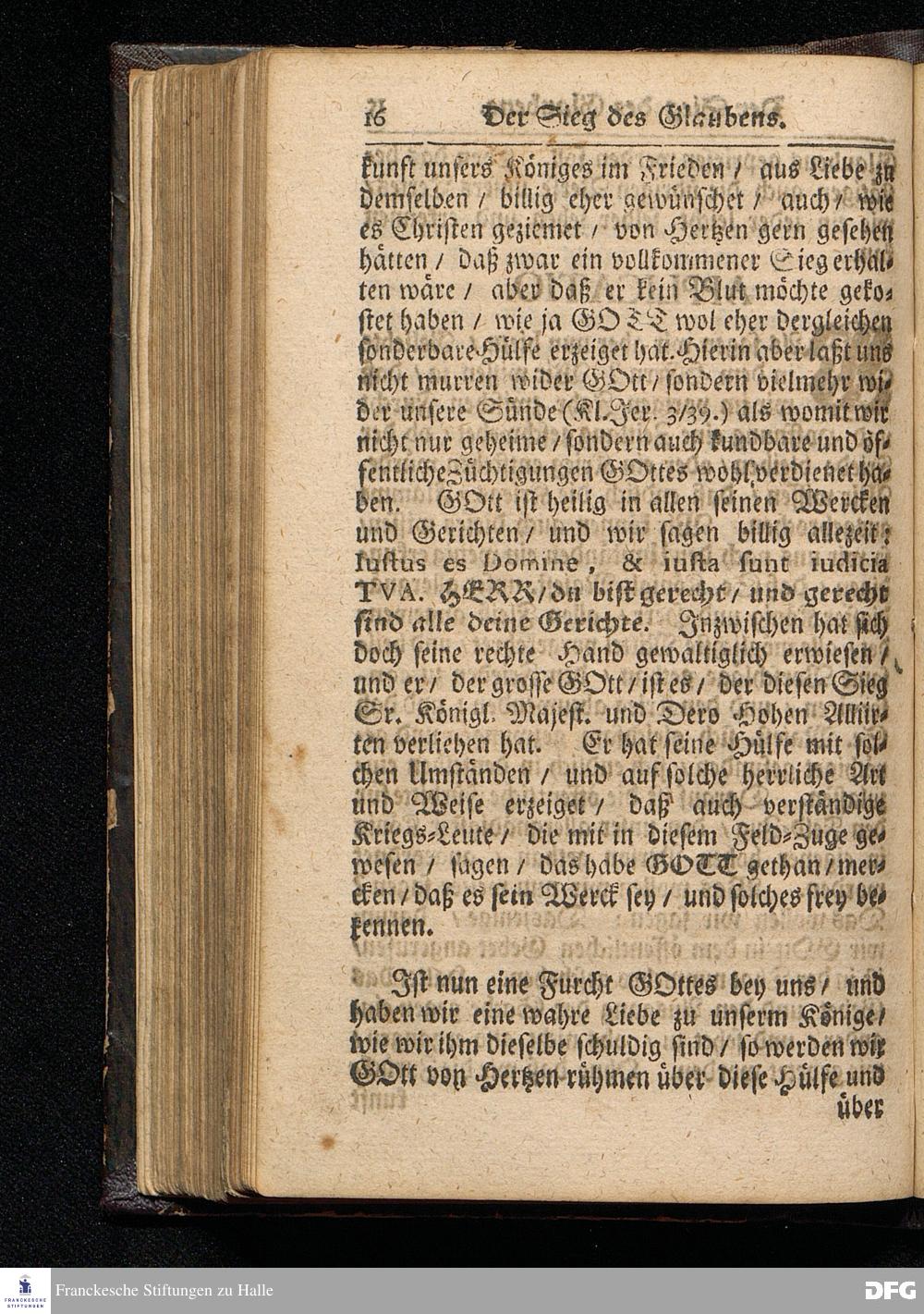 Der Sieg des Glaubens / Am Isten Sonntag nach Epiphanias MDCCXVI. An welchem / auf höchste Königliche Verordnung / das Danck=Fest wegen des in Pommern glücklich geendeten Feld=Zuges gefeyret worden / Aus Psalm.XX. v.6--10. In der St.Ulrichs=Kirche in Halle vorgestellet von August Hermann Francken / S.Theol.Prof.& Past.zu S.Ulrich / und des Gymnasii Scholarcha. HALLE / Gedruckt und zu finden im Wäysen=Hause / 1716.
