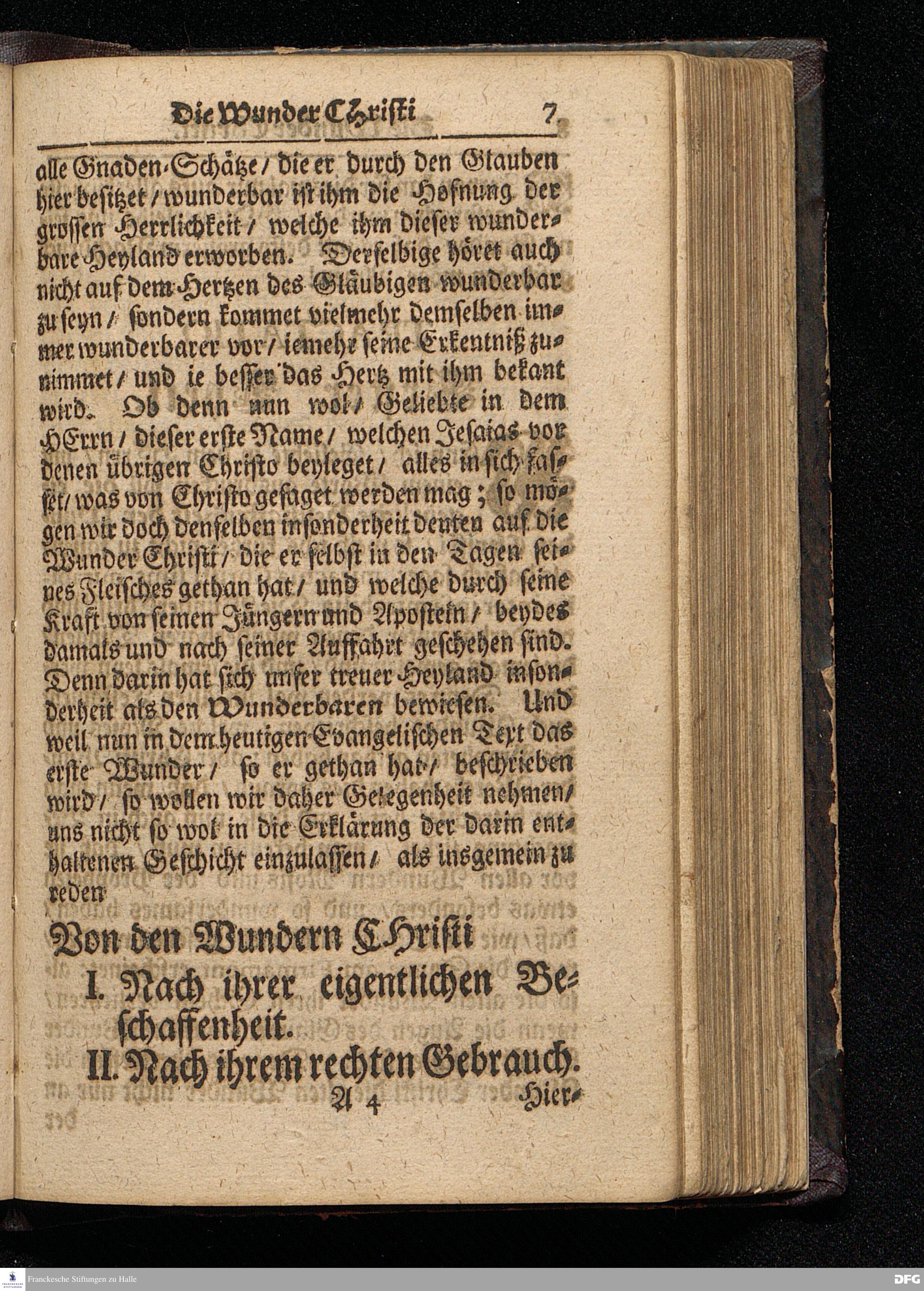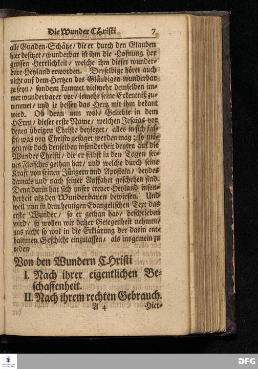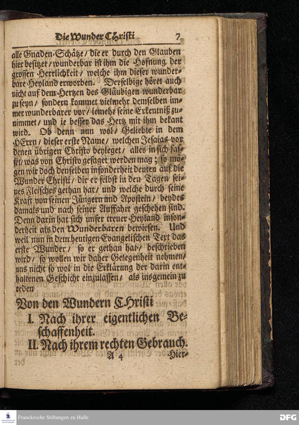 Die Wunder Christi / So wol Nach ihrer eigentlichen Beschaffenheit / als auch nach ihrem rechten Gebrauch / Aus dem Evangelischen Text Joh.II, 1--11. Am IIdern Sonntag nach Epiphanias MDCCXVI. Und dem darauf diesmal verlegten Crönungs=Fest / In der St.Ulrichs=Kirche in Halle vorgestellet von August Herman[n] Francken / S.Theolog.Prof.& Past.zu S.Ulrich / und des Gymnasii Scholarcha. HALLE / Gedruckt und zu finden im Wäysen=Hause. Anno 1716.