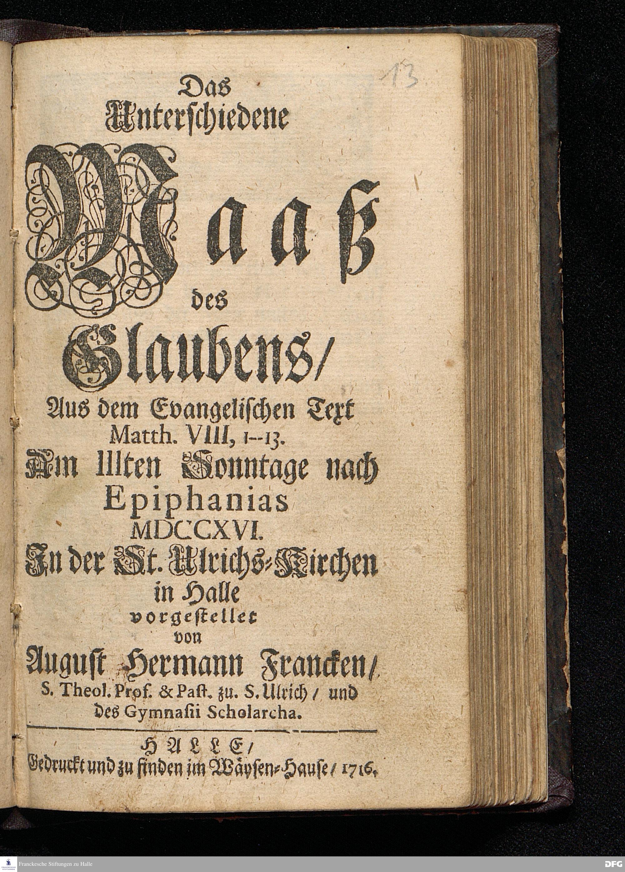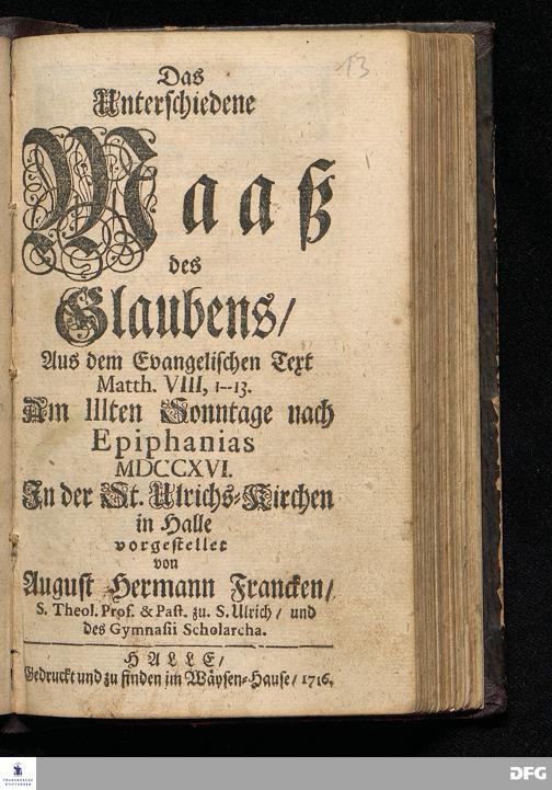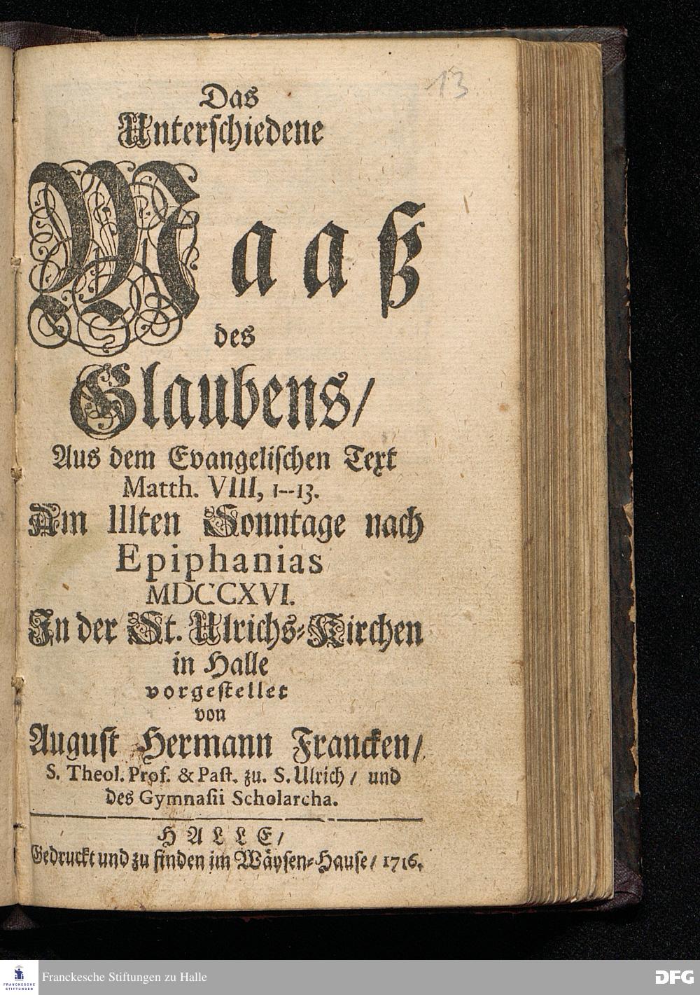 Das Unterschiedene Maaß des Glaubens / Aus dem Evangelischen Text Matth.VIII, 1--13. Am IIIten Sonntage nach Epiphanias MDCCXVI. In der St.Ulrichs=Kirchen in Halle vorgestellet von August Hermann Francken / S.Theol.Prof.& Past.zu S.Ulrich / und des Gymnasii Scholarcha. HALLE / Gedruckt und zu finden im Wäysen=Hause / 1716.