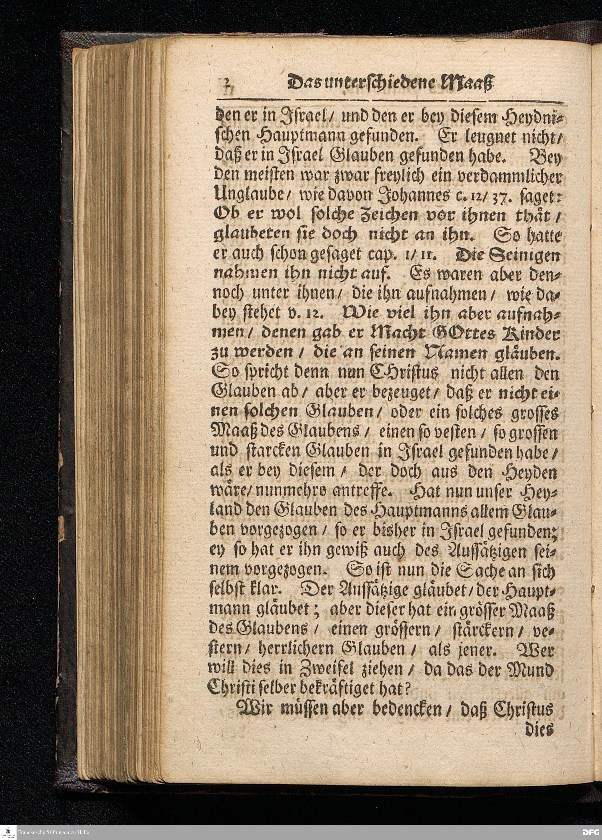 Das Unterschiedene Maaß des Glaubens / Aus dem Evangelischen Text Matth.VIII, 1--13. Am IIIten Sonntage nach Epiphanias MDCCXVI. In der St.Ulrichs=Kirchen in Halle vorgestellet von August Hermann Francken / S.Theol.Prof.& Past.zu S.Ulrich / und des Gymnasii Scholarcha. HALLE / Gedruckt und zu finden im Wäysen=Hause / 1716.