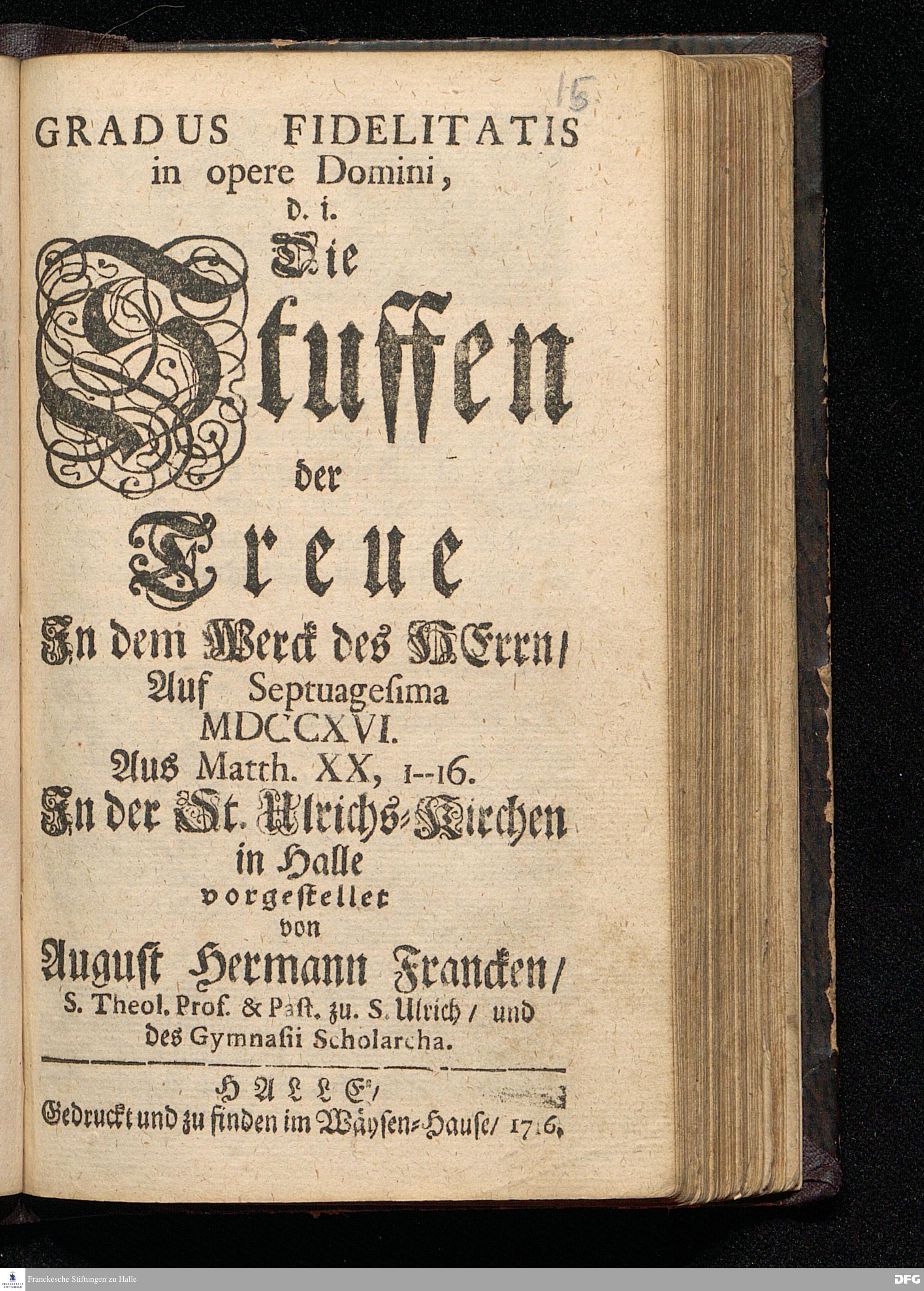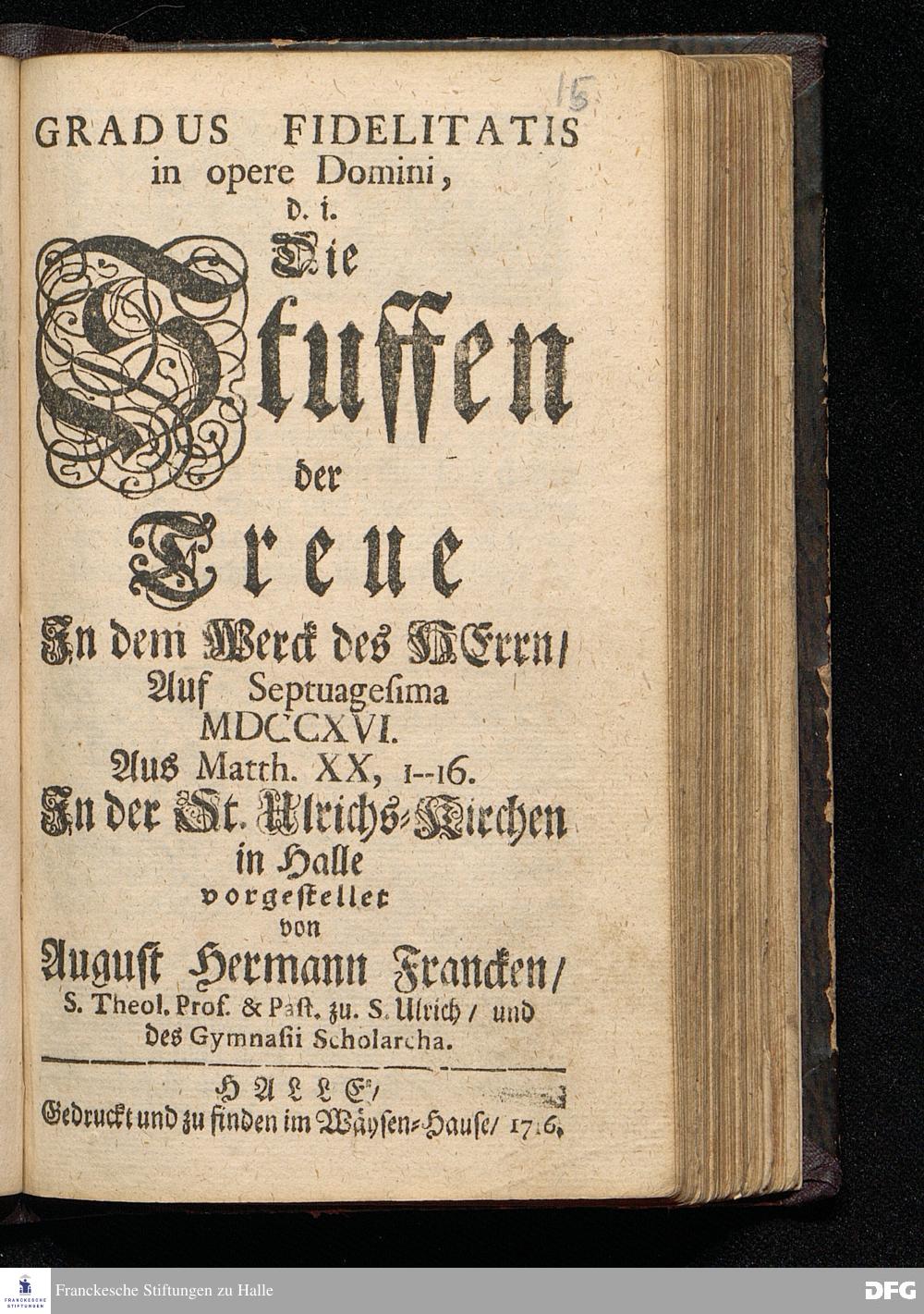 GRADUS FIDELITATIS in opere Domini, d.i. Die Stuffen der Treue In dem Werck des HErrn / Auf Septuagesima MDCCXVI. Aus Matth.XX, 1--16. In der St.Ulrichs=Kirchen in Halle vorgestellet von August Hermann Francken / S.Theol.Prof.& Past.zu S.Ulrich / und des Gymnasii Scholarcha. HALLE / Gedruckt und zu finden im Wäysen=Hause. 1716.