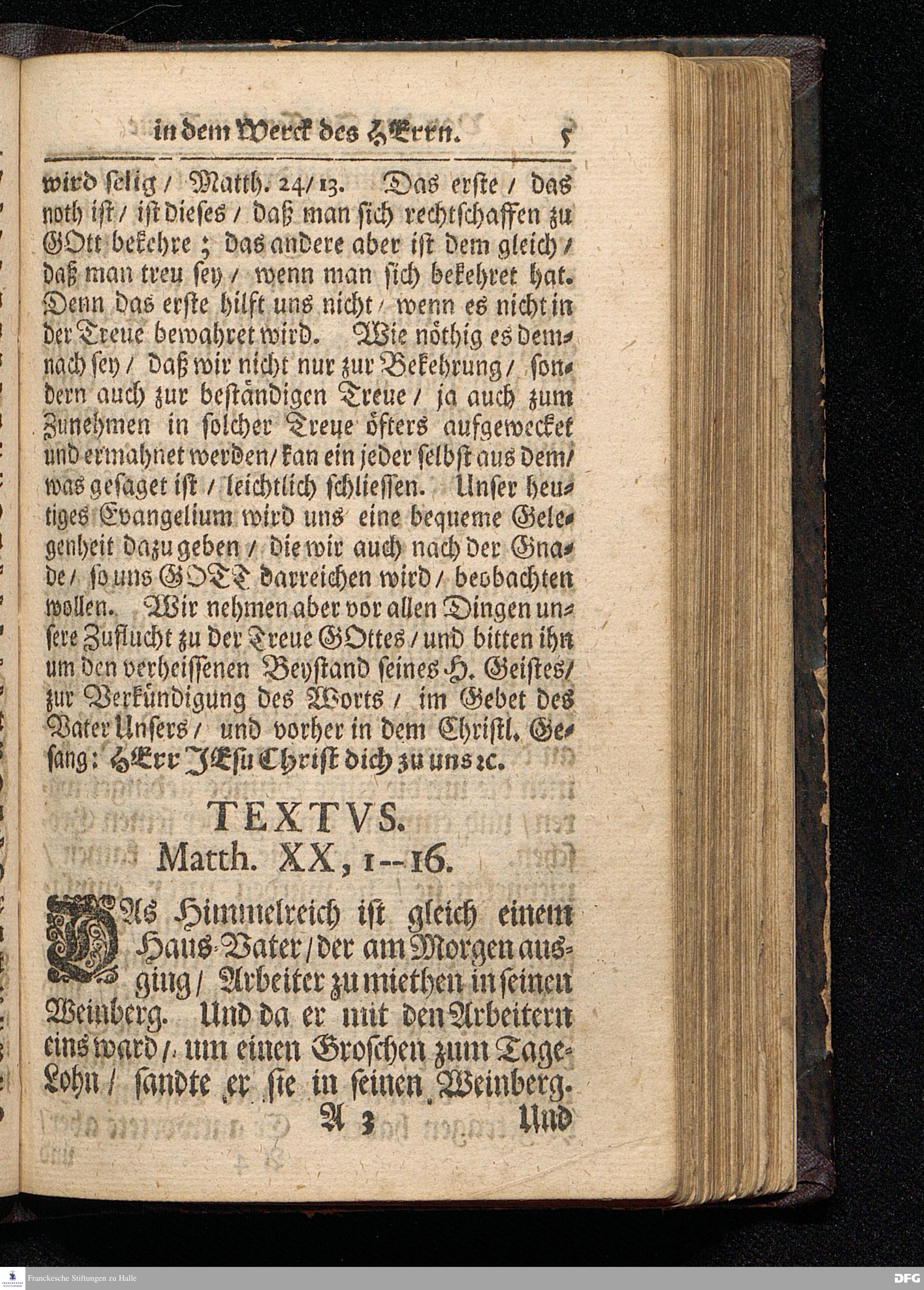 GRADUS FIDELITATIS in opere Domini, d.i. Die Stuffen der Treue In dem Werck des HErrn / Auf Septuagesima MDCCXVI. Aus Matth.XX, 1--16. In der St.Ulrichs=Kirchen in Halle vorgestellet von August Hermann Francken / S.Theol.Prof.& Past.zu S.Ulrich / und des Gymnasii Scholarcha. HALLE / Gedruckt und zu finden im Wäysen=Hause. 1716.