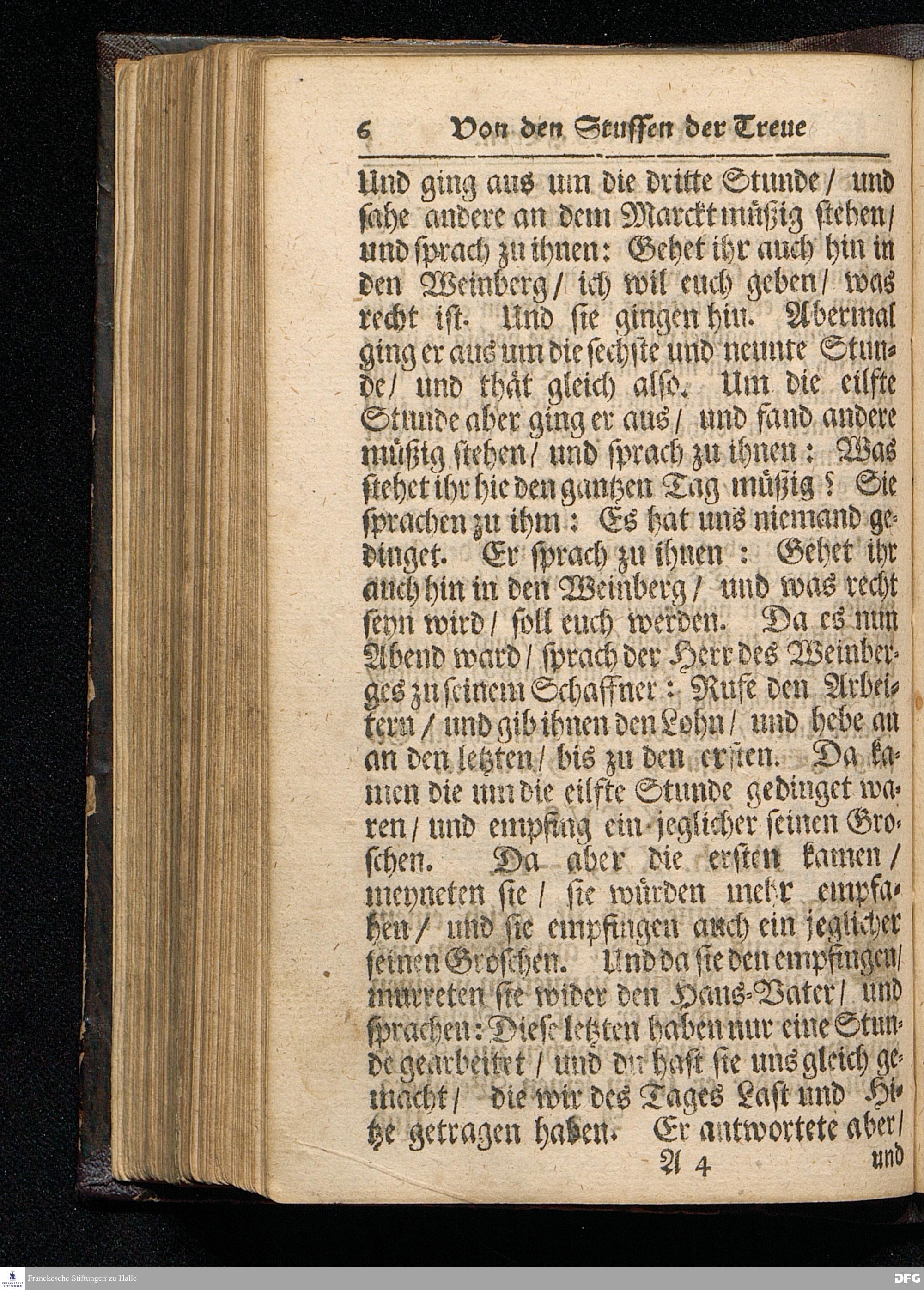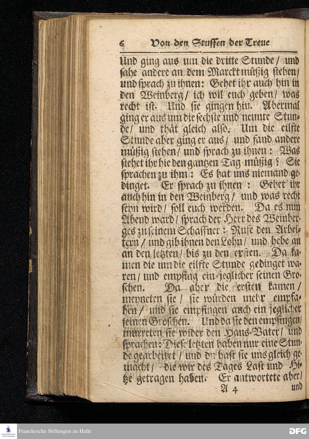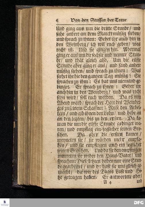 GRADUS FIDELITATIS in opere Domini, d.i. Die Stuffen der Treue In dem Werck des HErrn / Auf Septuagesima MDCCXVI. Aus Matth.XX, 1--16. In der St.Ulrichs=Kirchen in Halle vorgestellet von August Hermann Francken / S.Theol.Prof.& Past.zu S.Ulrich / und des Gymnasii Scholarcha. HALLE / Gedruckt und zu finden im Wäysen=Hause. 1716.
