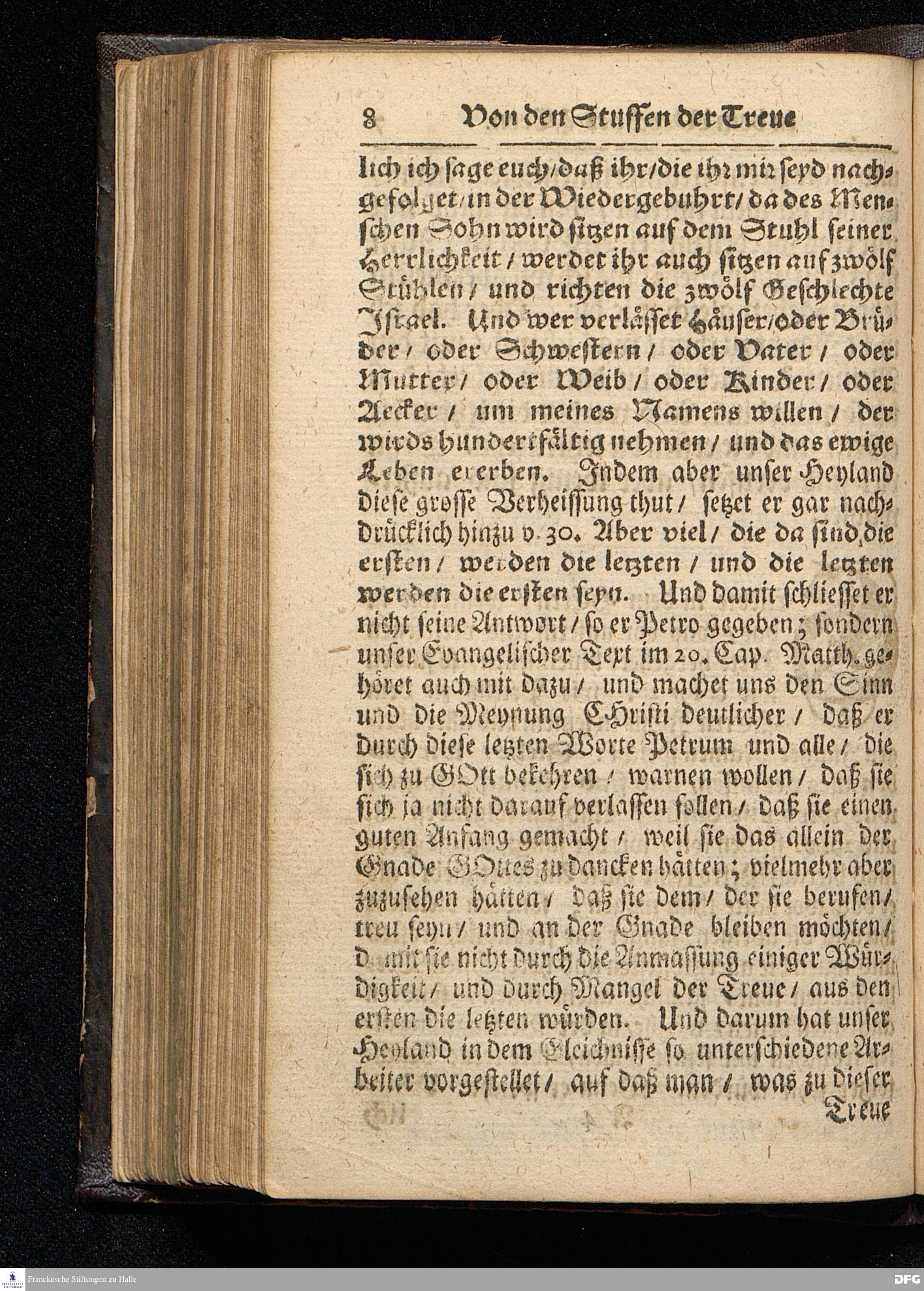 GRADUS FIDELITATIS in opere Domini, d.i. Die Stuffen der Treue In dem Werck des HErrn / Auf Septuagesima MDCCXVI. Aus Matth.XX, 1--16. In der St.Ulrichs=Kirchen in Halle vorgestellet von August Hermann Francken / S.Theol.Prof.& Past.zu S.Ulrich / und des Gymnasii Scholarcha. HALLE / Gedruckt und zu finden im Wäysen=Hause. 1716.
