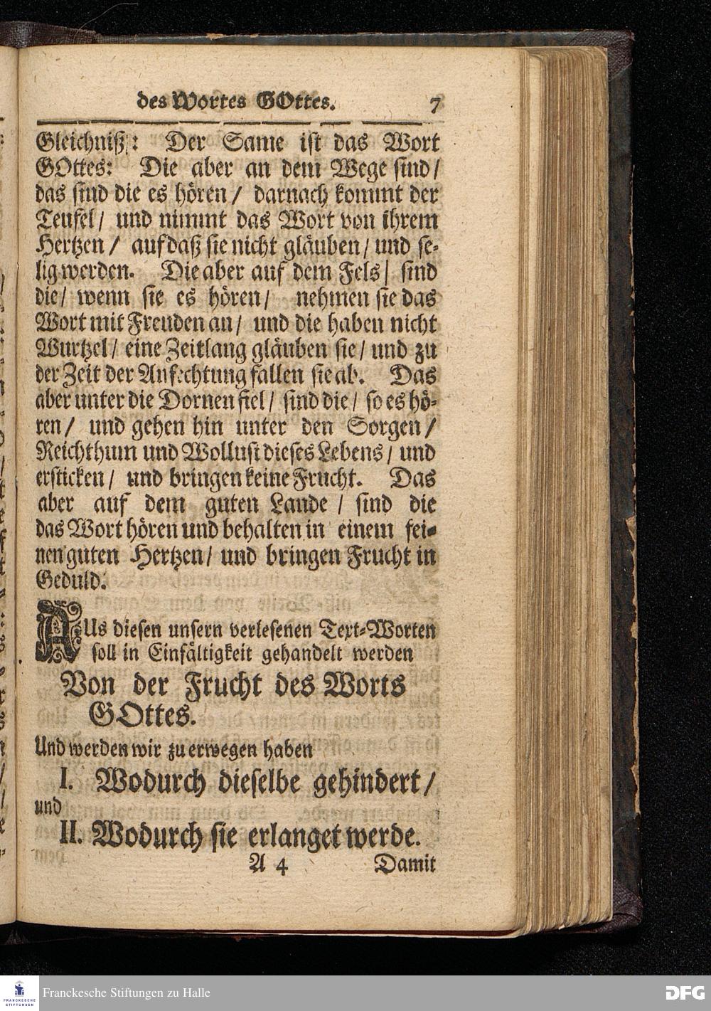 Die Frucht des Wortes Gottes / Auf Sexagesima MDCCXVI. Aus Luc.VIII,4--15. In der St.Ulrichs=Kirchen in Halle / vorgestellet von August Hermann Francken / S.Theol.Prof.& Past.zu S.Ulrich / und des Gymnasii Scholarcha. HALLE / Gedruckt und zu finden im Wäysen=Hause / 1716