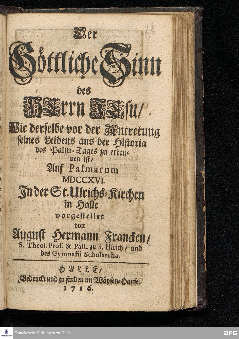 Der Göttliche Sinn des HErrn JEsu / Wie derselbe vor der Antretung seines Leidens aus der Historia des Palm=Tages zu erkennen ist / Auf Palmarum MDCCXVI. In der St.Ulrichs=Kirchen in Halle vorgestellet von August Hermann Francken / S.Theol.Prof.& Past.zu S.Ulrich / und des Gymnasii Scholarcha. HALLE / Gedruckt und zu finden im Wäysen=Hause. 1716.